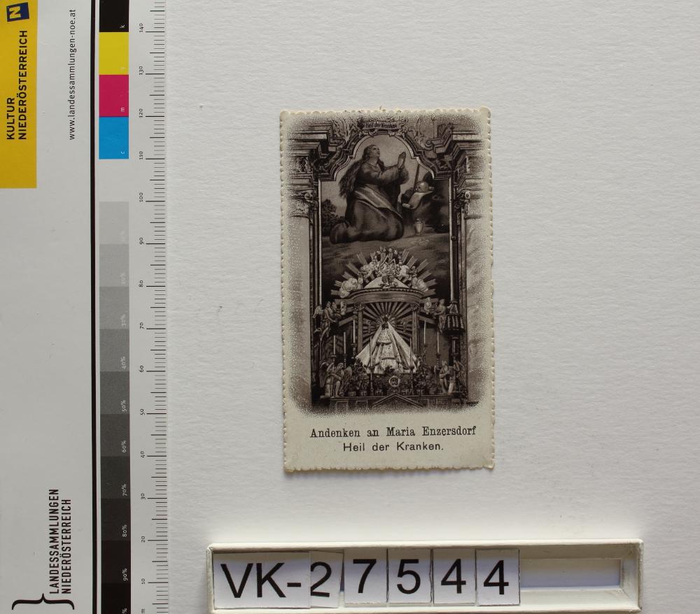 Maria Enzersdorf, "Maria Heil der Kranken"; Vorderseite: Gnadenstatue = Maria mit Kind, Gnadenaltar, Maria Magdalena (Büßerin), "Andenken an Maria Enzersdorf/ Heil der Kranken"; Rückseite: "Gebet", "Verlag F. J. Schadek Wien"