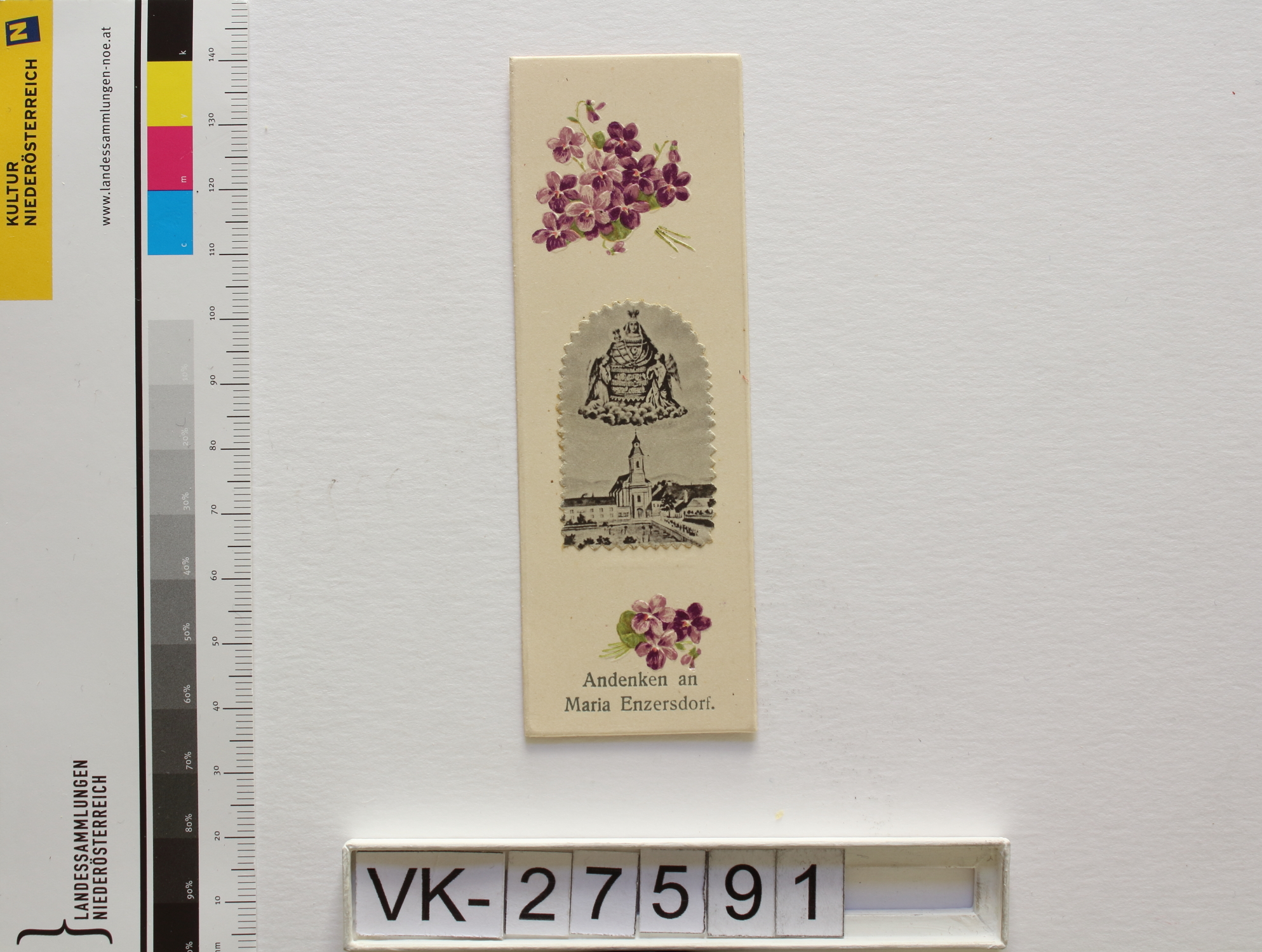 Maria Enzersdorf, "Maria Heil der Kranken"; Vorderseite: Gnadenstatue = Maria mit Kind, Wallfahrtskirche, Engel, Blumen (Veilchen), "Andenken an Maria Enzersdorf"; Rückseite: Gebet