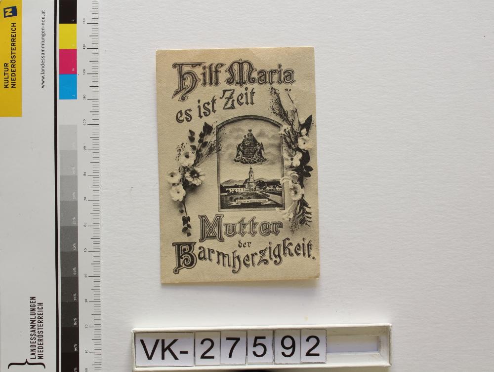 Maria Enzersdorf, "Maria Heil der Kranken"; Vorderseite: Gnadenstatue = Maria mit Kind, Wallfahrtskirche, Engel, Blumen (Lilie, Rosen?), "Hilf Maria es ist Zeit/ Mutter der Barmherzigkeit", "Andenken an Maria Enzersdorf"; Rückseite: Gebet "Bittruf zu Maria", "Andenken an Maria Enzersdorf"