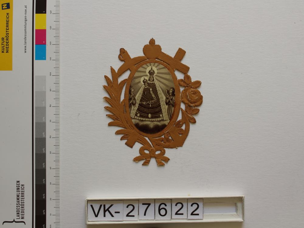 Maria Enzersdorf, "Maria Heil der Kranken"; Vorderseite: Gnadenstatue = Maria mit Kind, Engel, Blumen (Rose), Anker, Herz, Kreuz; Rückseite: Gebet "Gnadenreiche Mutter Jesu", "Andenken an St. Maria Enzersdorf", "Verlag von Franz Schemm Nürnberg"
