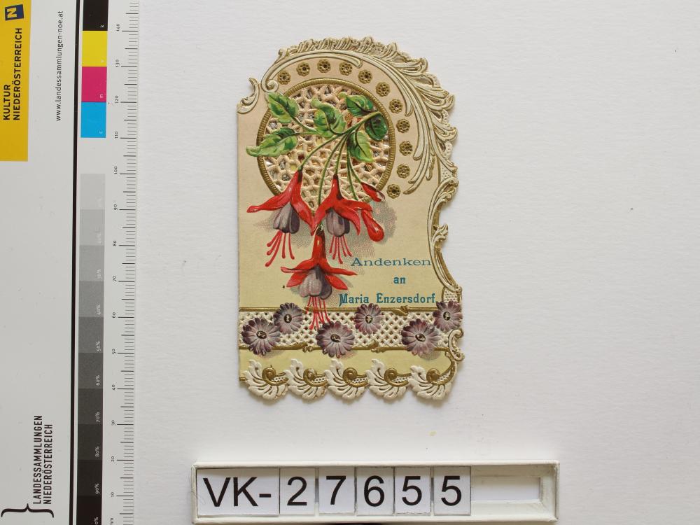 Maria Enzersdorf, "Maria Heil der Kranken"; gefaltet; Vorderseite: Blumen( ?), "Andenken an Maria Enzersdorf"; Innenseite: Gnadenstatue = Maria mit Kind; Rückseite: "Gebet"