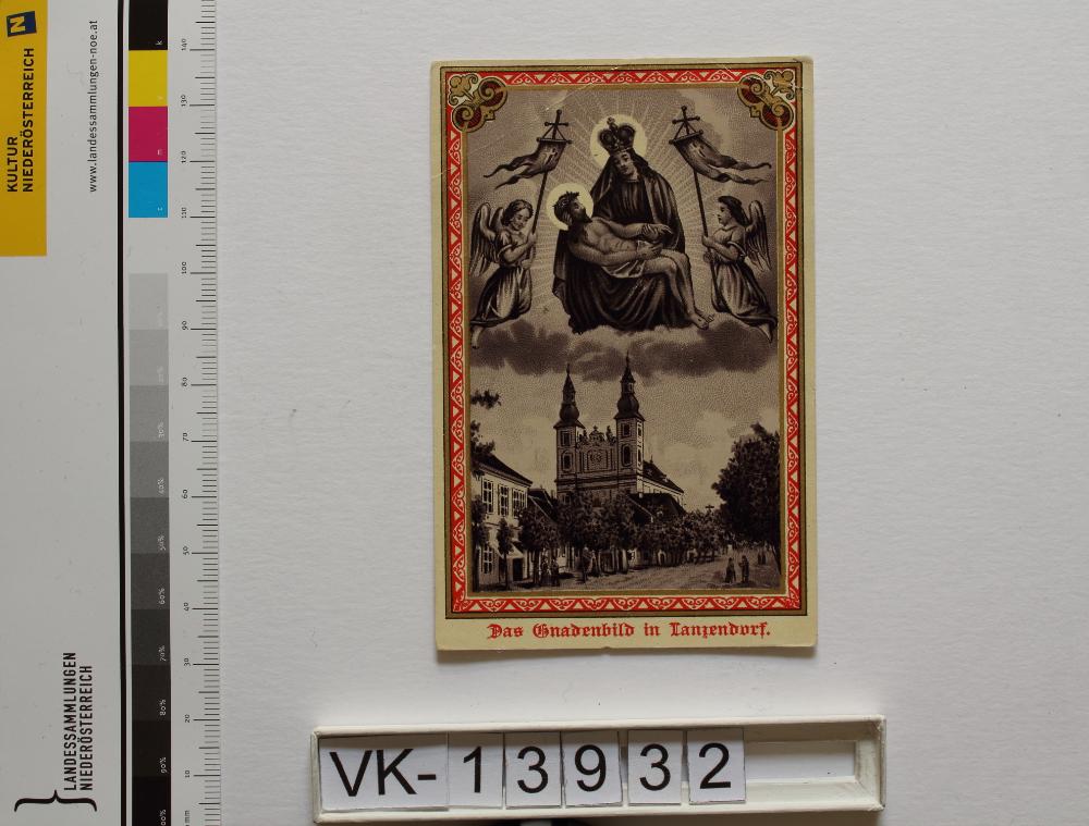 Maria Lanzendorf, "Sieben Schmerzen Mariens"; Vorderseite: Gnadenstatue = Pietà, Wallfahrtskirche, Engel, "Das Gnadenbild in Lanzendorf"; Rückseite: Gebet "Zur Maria geh´!", "Verlag v. F. J. Schadek Wien"; monogrammiert "FW"