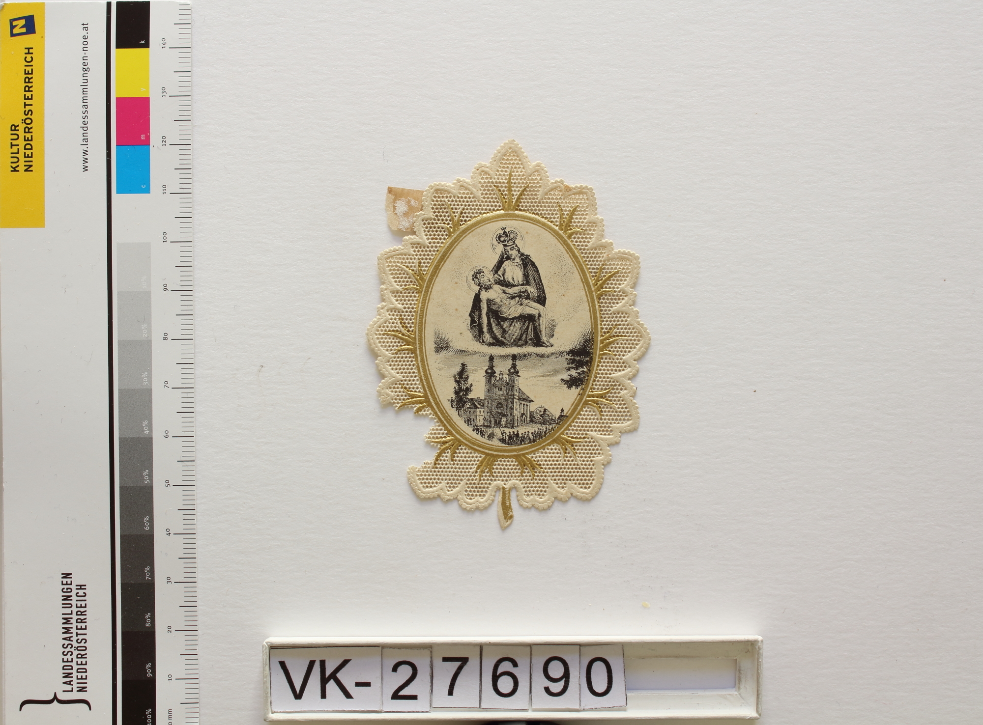 Maria Lanzendorf, "Sieben Schmerzen Mariens"; Vorderseite: Gnadenstatue = Pietà, Wallfahrtskirche; Rückseite: Gebet "Gnadenreiche Mutter Jesu", "Zum frommen Andenken", handschriftlich "Ma. Lanzendorf", "Bei A. Schaufele Stuttgart"; Bildchen in Form eines Blattes