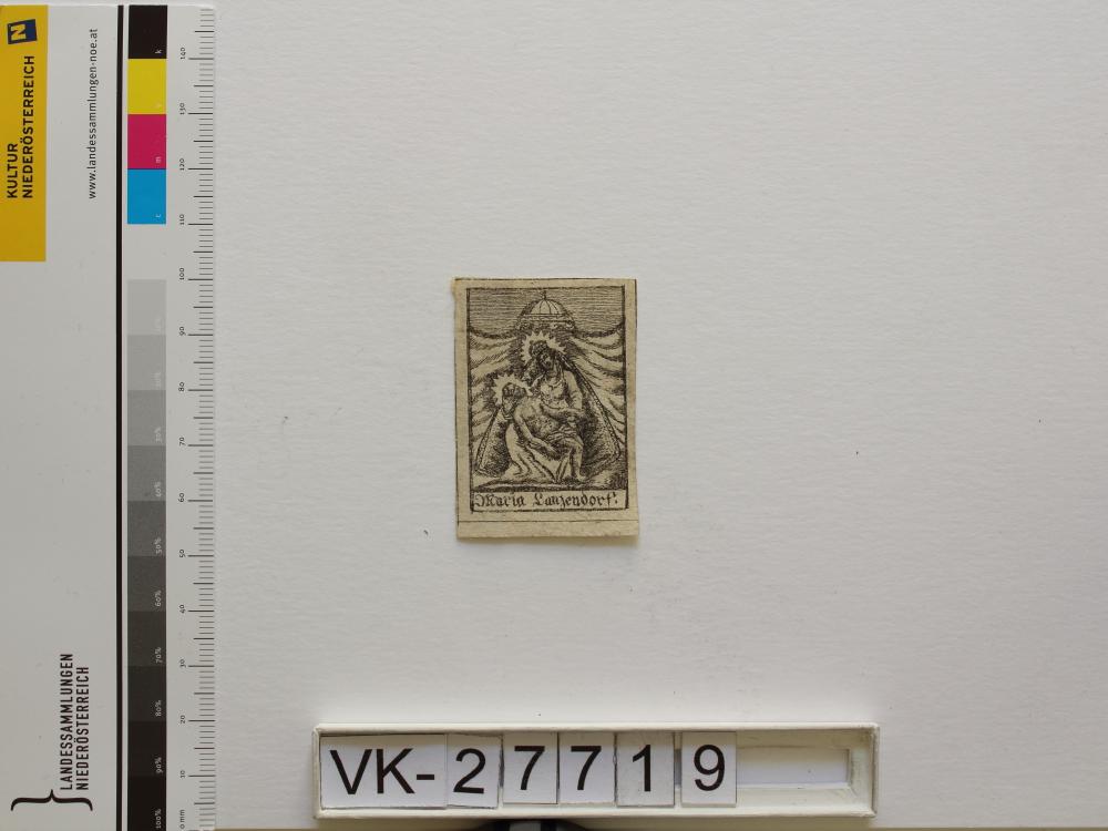 Maria Lanzendorf, "Sieben Schmerzen Mariens"; Vorderseite: Gnadenstatue = Pietà, "Maria Lanzendorf"; Rückseite: monogrammiert "FW", "V-9141/39" (=doppelt vergebene Inventarnummer); Eintrag Inventarbuch: "9141 Andachtsbildchen Maria Ellend"