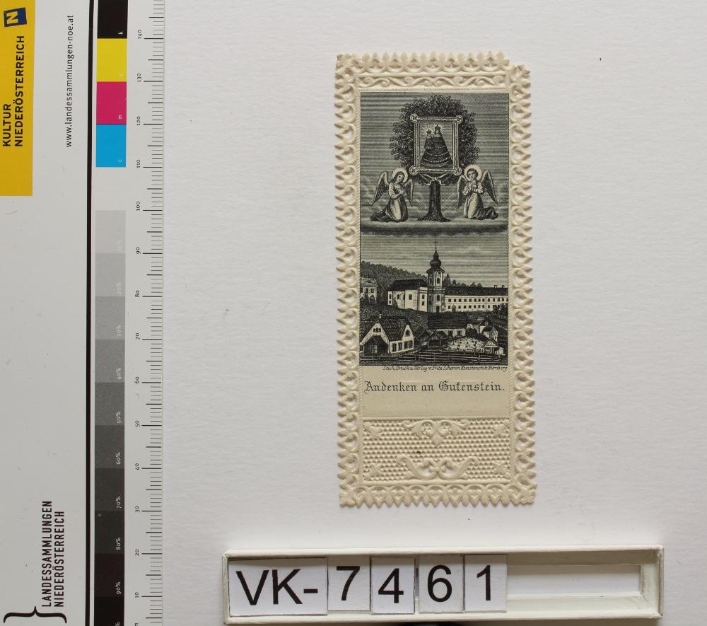 Mariahilfberg bei Gutenstein; Vorderseite: Gnadenbild = Maria mit Kind, Wallfahrtskirche, Engel, "Andenken an Gutenstein", "Stich, Druck u. Verlag v. Fritz Schemm Kunstanstalt Nürnberg"; Rückseite: "Gebet"; Eintrag Inventarbuch: Wallfahrtsbild, Slg. Klar