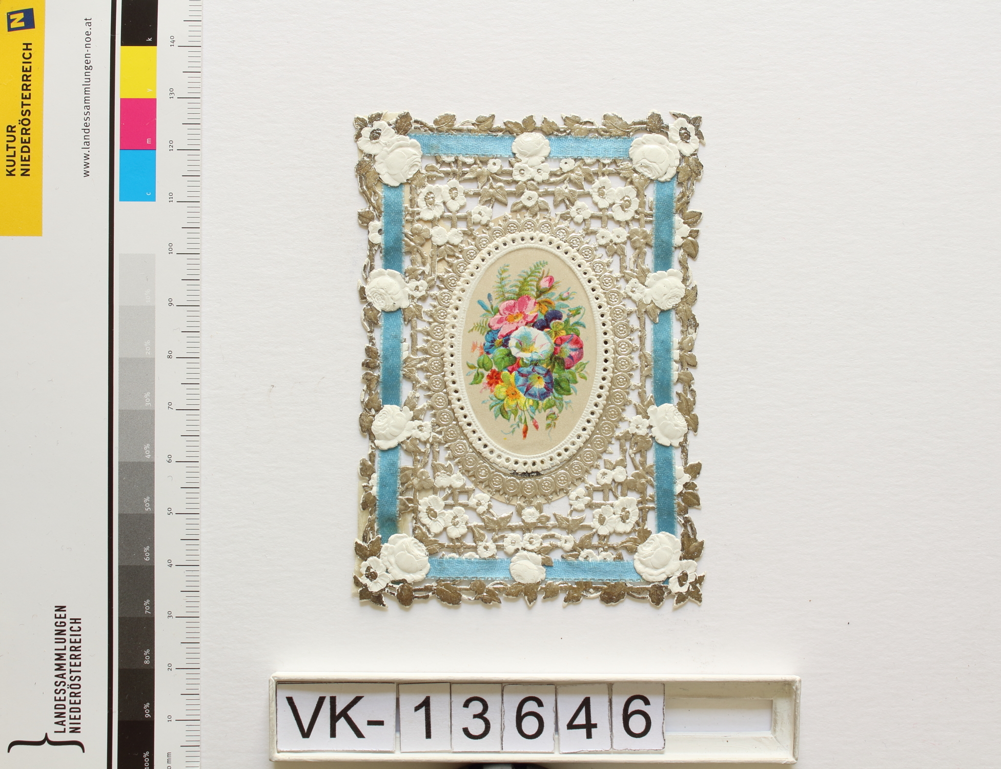 Material/TechnikSpitzenbild; Druckgrafik polychrom, Sepia; Prägung silber, coloriert weiß, Textilband hellblau