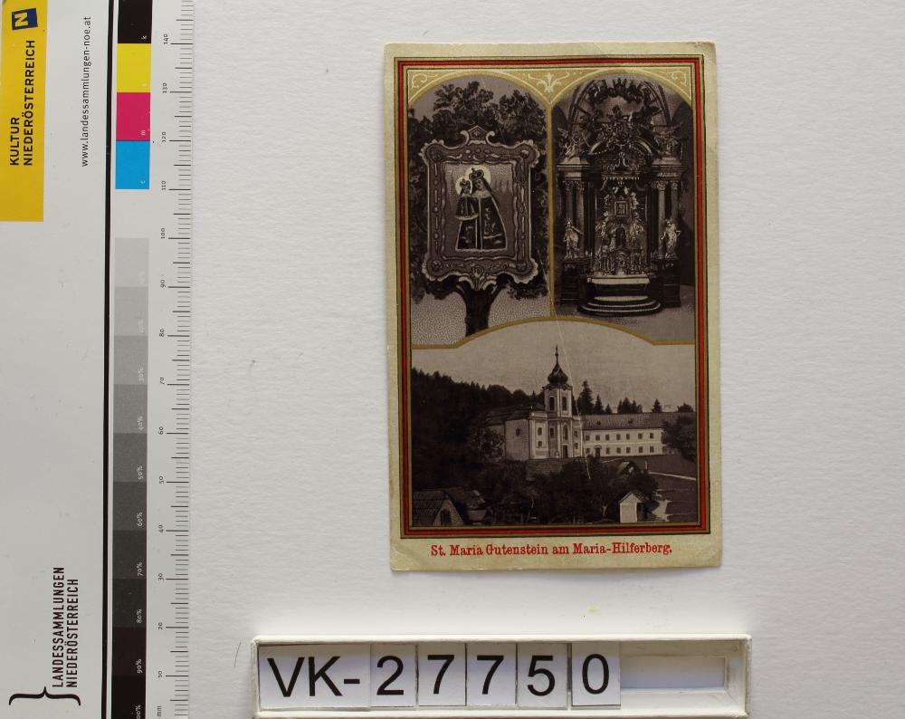 Mariahilfberg bei Gutenstein; Vorderseite: Gnadenbild = Maria mit Kind, Wallfahrtskirche, Gnadenaltar, "St. Maria Gutenstein am Maria-Hilferberg"; Rückseite: Gebet, "Verlag v. F. J. Schadek Wien"