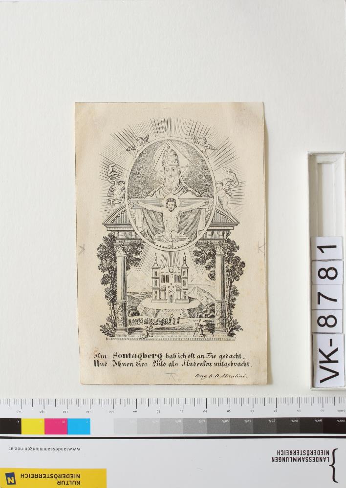 Sonntagberg; Vorderseite: Gnadenbild = Gnadenstuhl, Basilika, Engel, Engelsköpfe, "Am Sonntagberg hab`ich oft an Sie gedacht und Ihnen dies Bild als Andenken mitgebracht", "Prag b. D: Maulini"; Rückseite: handschriftlich "NÖ"; Eintrag Inventarbuch: Wallfahrtsbildchen, Sonntagberg, Slg. Klar.