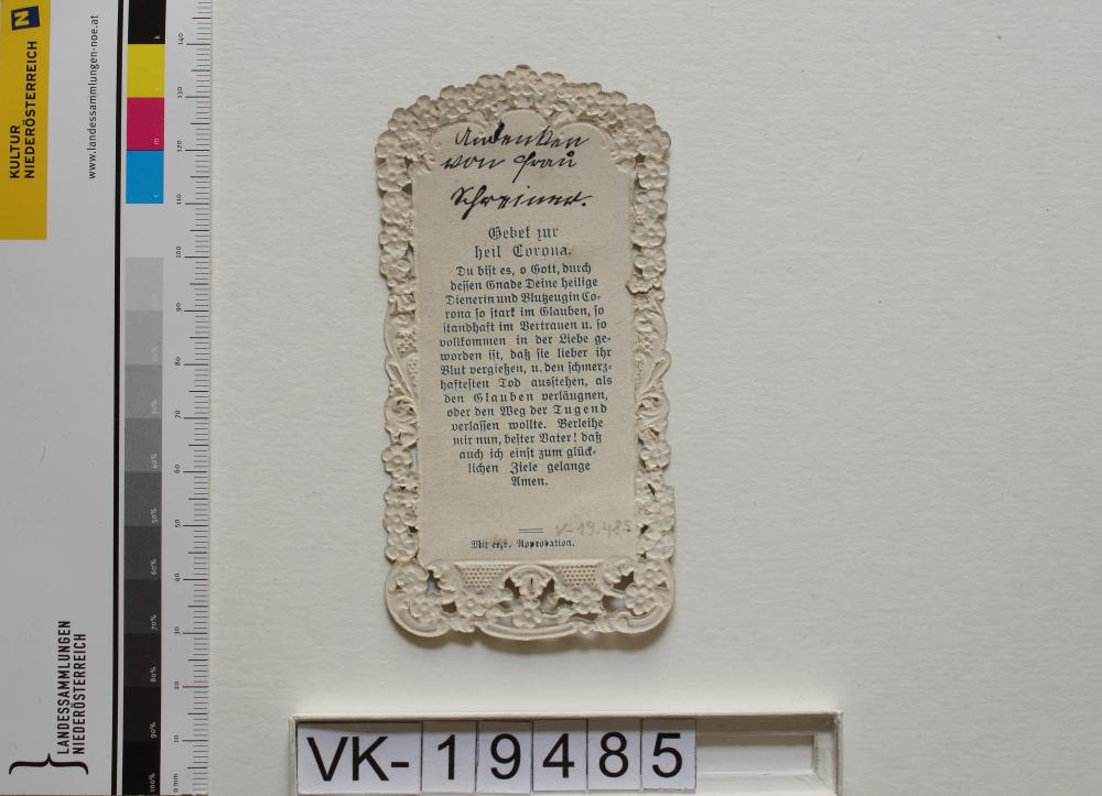 Sankt Corona am Wechsel; Vorderseite: Gnadenbild = Hl. Corona als Gekrönte (mit Krone, Palmzweig, Lilie), Wallfahrtskirche, Engel, Blumen (Vergissmeinnicht), "Hl. Corona bitt für uns"; Rückseite: "Gebet zur heil Korona", handschriftlich "Andenken von Frau Schreiner"