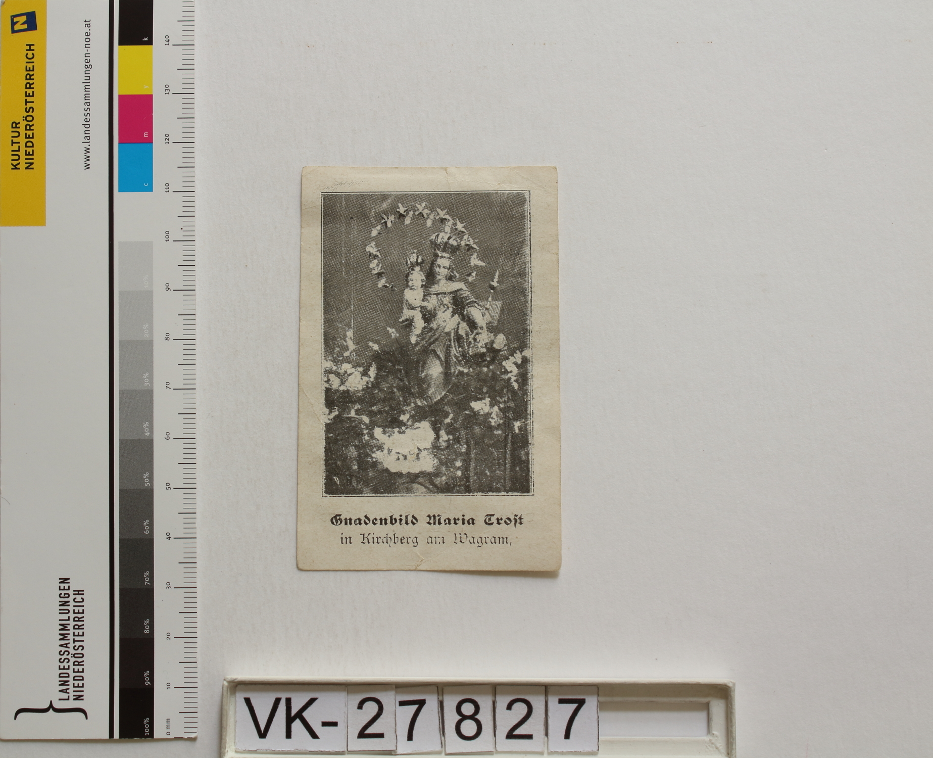 Kirchberg am Wagram, "Maria Trost"; Vorderseite: Gnadenstatue = Maria mit Kind; "Gnadenbild Maria Trost in Kirchberg am Wagram"; Rückseite: "Gebet", "Verlag von Karl Burgstaller Kirchberg am Wagram"