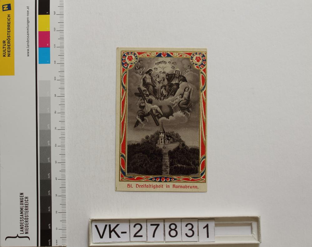 Karnabrunn, "Allerheiligste Dreifaltigkeit"; Vorderseite: Gnadenbild = Allerheiligste Dreifaltigkeit, Wallfahrtskirche, Engel, Engelsköpfe, "Hl. Dreifaltigkeit in Karnabrunn"; Rückseite: Gebet " Die allerheiligste Dreifaltigkeit", "Verlag von Gregor Fischer Innsbruck"