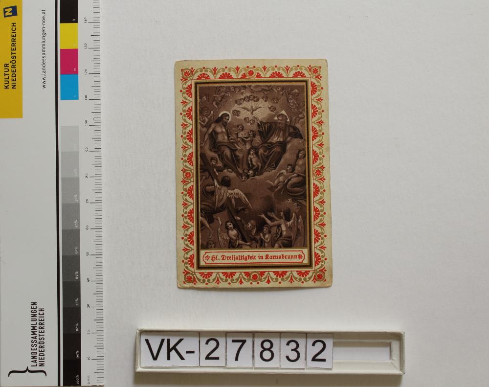 Karnabrunn, "Allerheiligste Dreifaltigkeit"; Vorderseite: Gnadenbild = Allerheiligste Dreifaltigkeit, Engel, Engelsköpfe, "Hl. Dreifaltigkeit in Karnabrunn"; Rückseite: "Gebet zur heiligsten Dreifaltigkeit", "Verlag v. F. J. Schadek Wien"