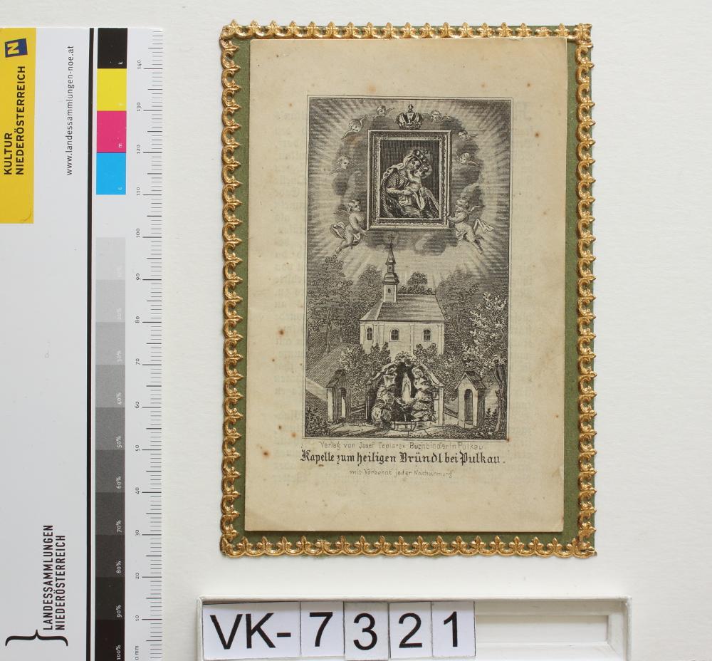 Pulkau, "Pulkauer Bründl"; gefaltet; Vorderseite: Gnadenbild = Maria mit Kind, Wallfahrtskapelle = Maria Bründl Kapelle mit Lourdesgrotte, Engel, Engelsköpfe, "Kapelle zum heilsigen Bründl bei Pulkau", "Verlag von Josef Teplarek, Buchbinder in Pulkau"; Innenseiten: Gründungsgeschichte, "Gebet"; verklebt auf KArton; Eintrag Inventarbuch: Gebetszettel, Druck, Slg. Klar.