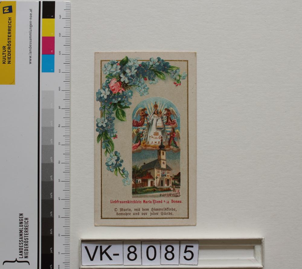 Haslau - Maria Ellend, "Maria an der Straße"; Vorderseite: Gnadenstatue = Maria mit Kind, Wallfahrtskirche, Engel, Blumen (Rosen, Vergissmeinnicht), "Liebfrauenkirchlein Maria Ellend a./d. Donau", "O Maria mit dem Gnadenkinde, bewahre uns vor jeder Sünde"; Rückseite: "Gebet des heiligen Germanus", "Verlag F. J. Schadek´s Www. Wien"; Eintrag Inventarbuch: Gebetszettel, Slg. Klar.