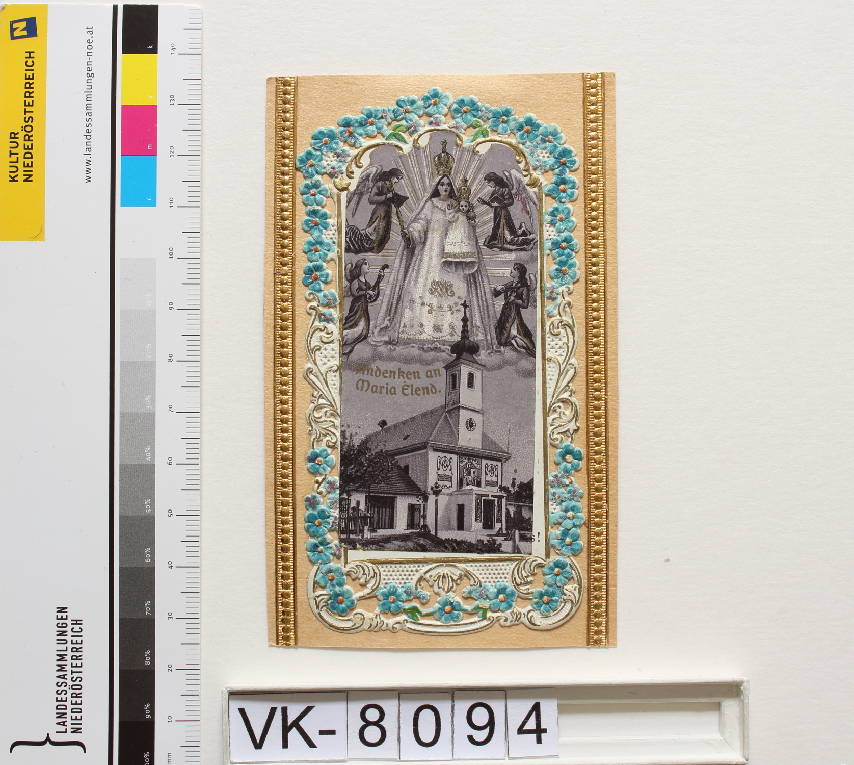 Haslau - Maria Ellend, "Maria an der Straße"; Vorderseite: Gnadenstatue = Maria mit Kind, Wallfahrtskirche, Engel, Blumen (Vergissmeinnicht), "Andenken an Maria Elend"; verklebt auf Karton; Eintrag Inventarbuch: Gebetszettel, Slg. Klar.