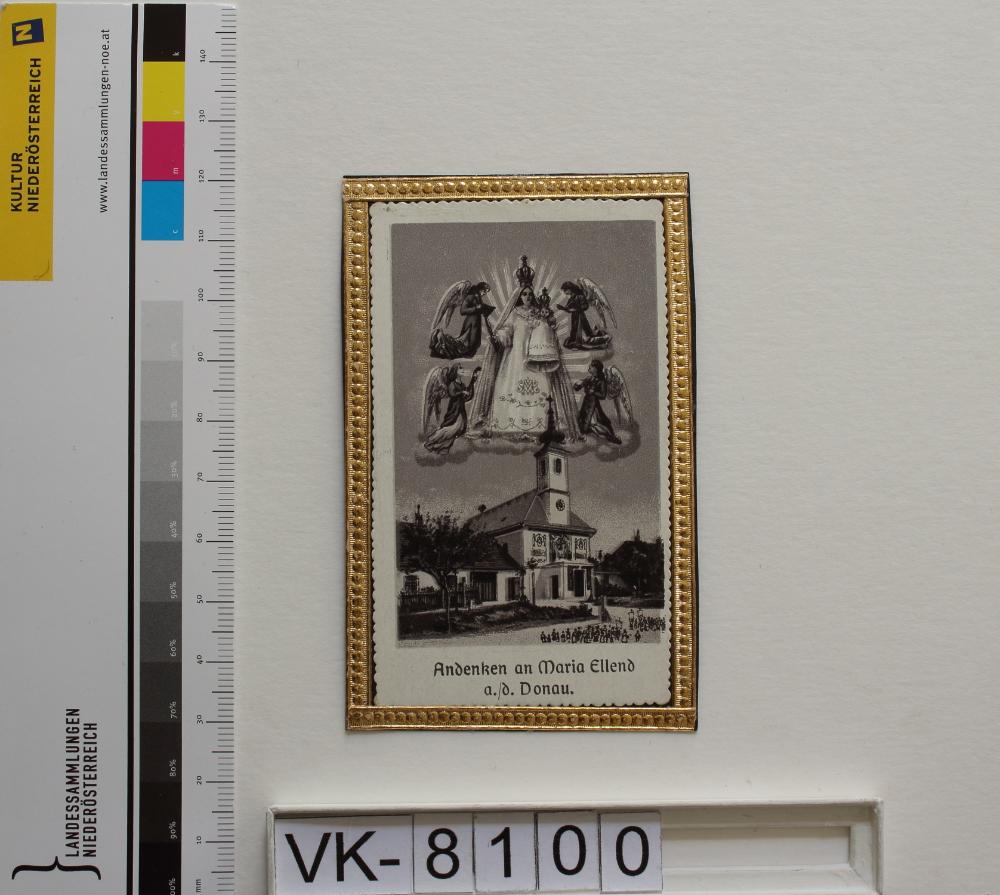 Haslau - Maria Ellend, "Maria an der Straße"; Vorderseite: Gnadenstatue = Maria mit Kind, Wallfahrtskirche, Engel, "Andenken Maria Ellend a./d. Donau"; verklebt auf Karton; Eintrag Inventarbuch: Gebetszettel, Slg. Klar.