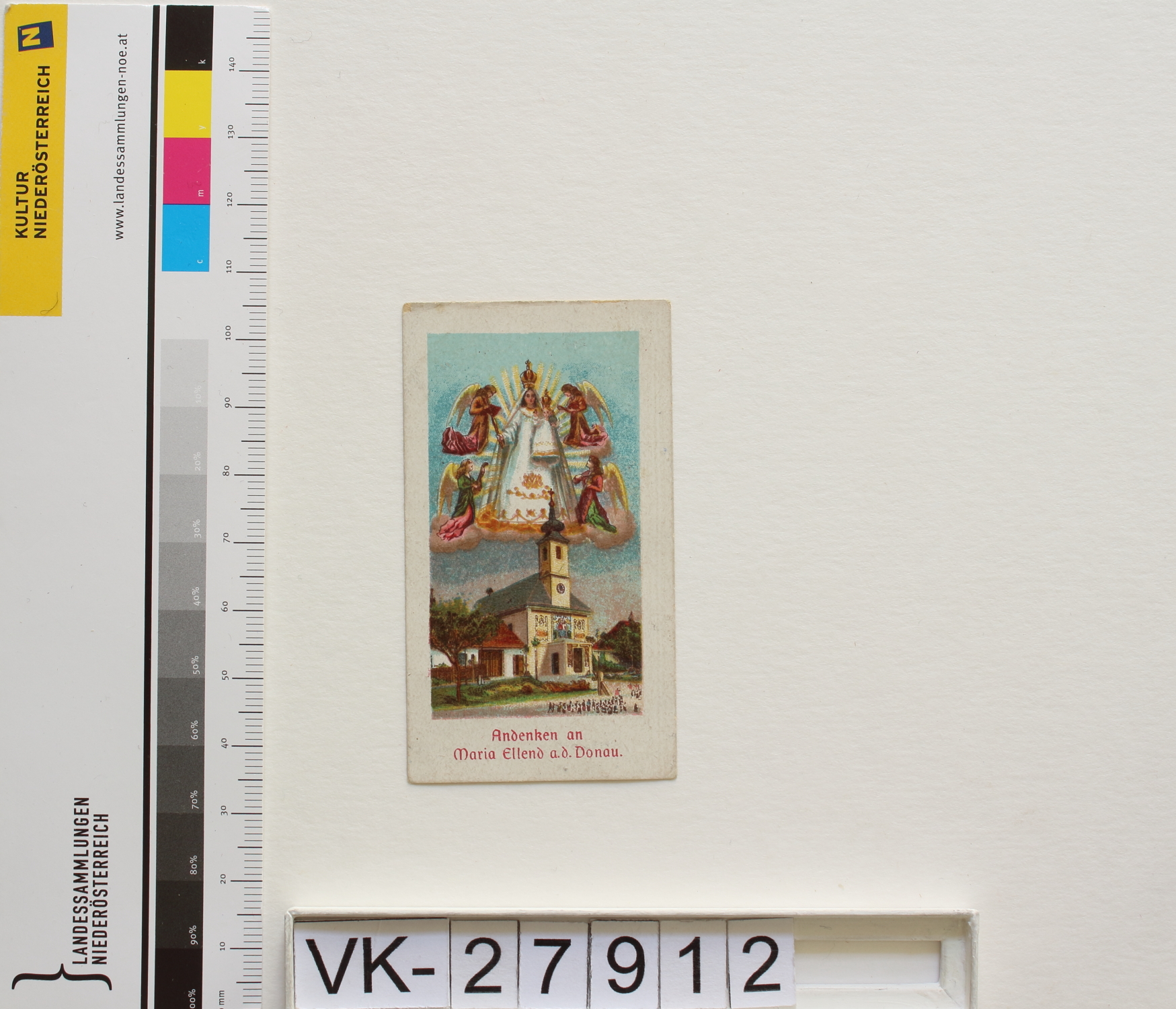 Haslau - Maria Ellend, "Maria an der Straße"; Vorderseite: Gnadenstatue = Maria mit Kind, Wallfahrtskirche, Engel, "Andenken an Maria Ellend a. d. Donau"; Rückseite: Gebet, "Gregor Fischer Innsbruck"