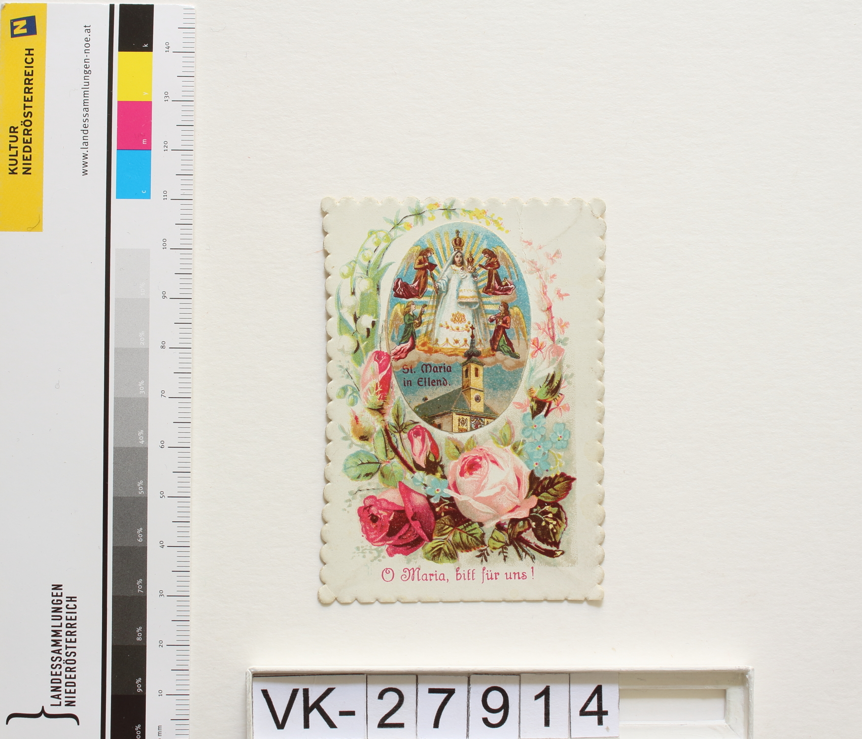 Haslau - Maria Ellend, "Maria an der Straße"; Vorderseite: Gnadenstatue = Maria mit Kind, Wallfahrtskirche, Engel, "St. Maria in Ellend", "O Maria, bitt für uns"; Rückseite: Gebet "Inniger Bittruf zu U. L. Frau", "2427/ Ars Catholica"