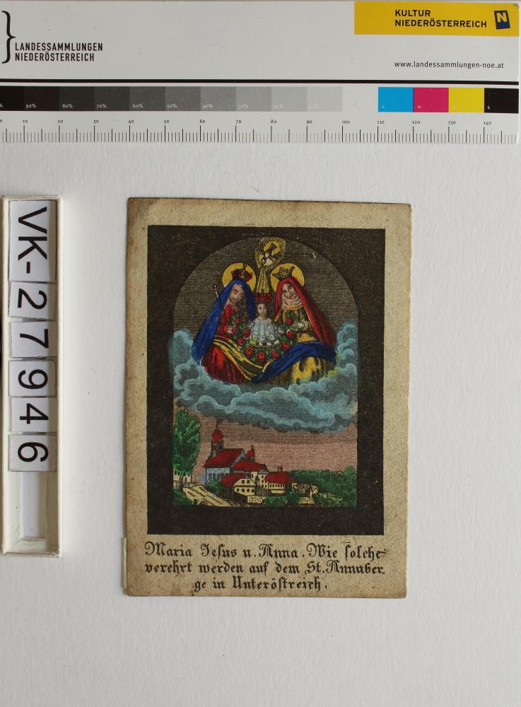 Annarotte, Annaberg, St. Anna Wallfahrtskirche; Vorderseite: Gnadenstatue = Anna Selbtritt = Anna Maria Jesus, Wallfahrtskirche, Heilig-Geist-Taube, Blumen (Rosen), "Maria Jesus u. Anna. Wie solche verehrt werden auf dem St. Annaberge in Unterösterreich"