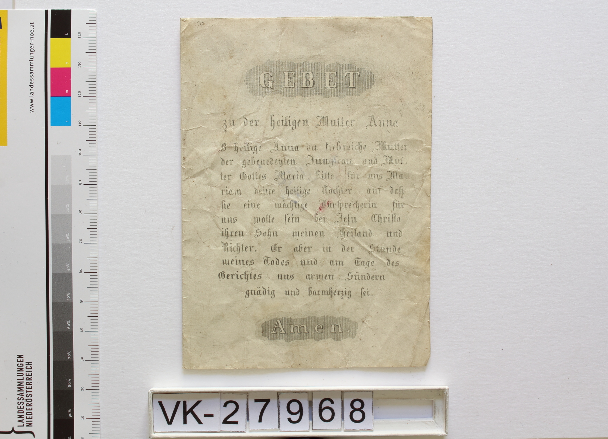 Annarotte, Annaberg, St. Anna Wallfahrtskirche; gefaltet; Vorderseite: "Gebet zu der heiligen Mutter Anna"; Rückseite: Gnadenstatue = Anna Selbtritt = Anna Maria Jesus, Wallfahrtskirche, Blumen (Rosen, Stiefmütterchen?), "Maria Jesus und Anna. Wie solche verehrt werden auf dem St. Annaberge in Niederösterreich", "Graz b. Nowohradsky"