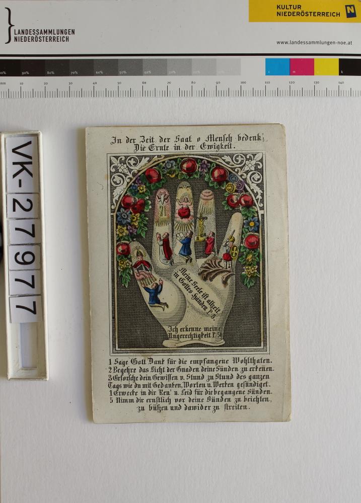 Annarotte, Annaberg, St. Anna Wallfahrtskirche; gefaltet; Vorderseite: Heilige Hand = Annahand mit 5 Sprüchen und dazu gehörigen figuralen Darstellungen; Innenseite: handschriftlich "2"; Rückseite: Gnadenstatue = Anna Selbtritt = Anna Maria Jesus, "Jesus, Maria und Anna wie sie auf dem heil. Annaberge auf dem Hochaltare verehrt werden"