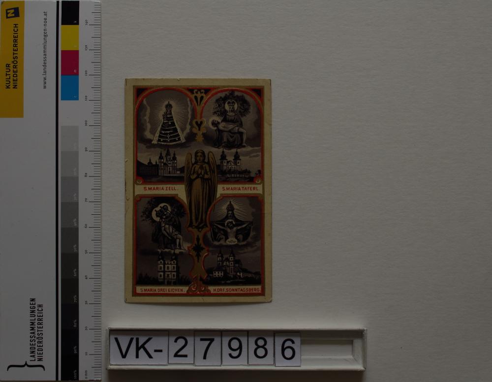 "Maria Schutz"; Vorderseite: Gnadenstatue = Maria mit Kind, Basilika, "S. Maria Zell"; Gnadenstatue = Pieta, Basilika, "S. Maria Taferl"; Gnadenstatue = Pieta, Basilika, "S. Maria Drei Eichen"; Gnadenstuhl, Basilika, "Hl. Drf. Sonntagsberg"; Engel; Rückseite: Gebet "Maria", "Verlag von Gregor Fischer Innsbruck"