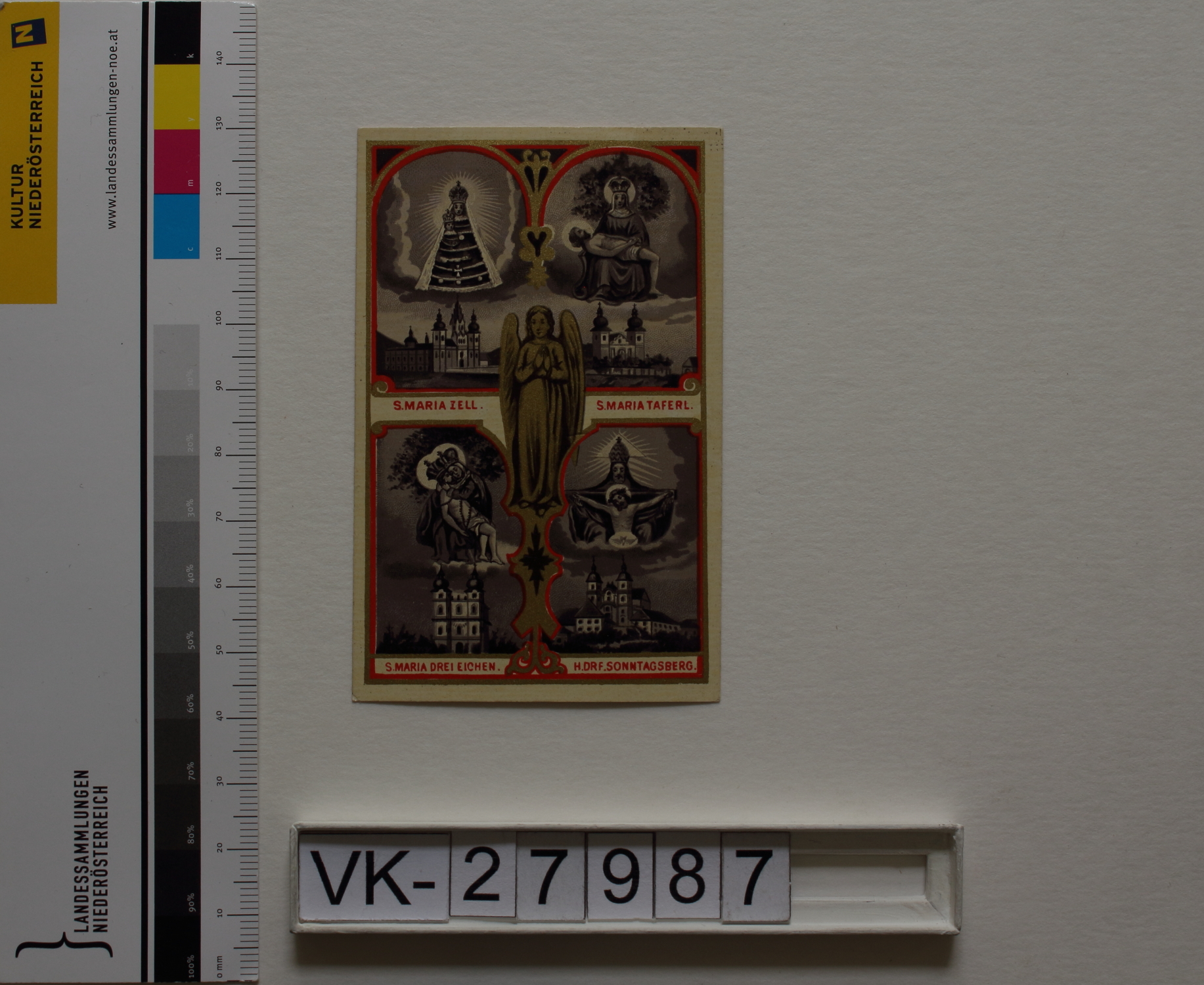 "Maria Schutz"; Vorderseite: Gnadenstatue = Maria mit Kind, Basilika, "S. Maria Zell"; Gnadenstatue = Pieta, Basilika, "S. Maria Taferl"; Gnadenstatue = Pieta, Basilika, "S. Maria Drei Eichen"; Gnadenstuhl, Basilika, "Hl. Drf. Sonntagsberg"; Engel; Rückseite: Gebet "Gruß an Maria", "Verlag von Gregor Fischer Innsbruck"