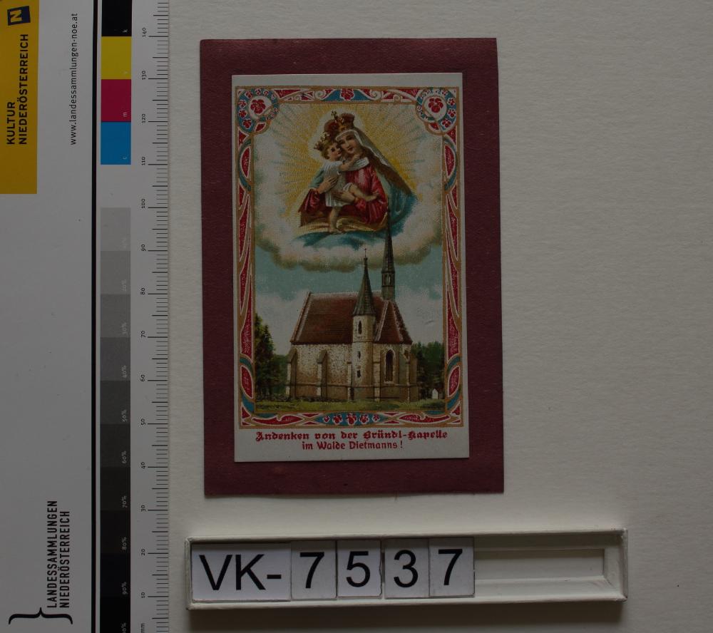 Dietmanns, "Bründlkapelle im Walde bei Dietmanns"; Vorderseite: Maria mit Kind, Wallfahrtskapelle, "Andenken von der Bründl-Kapelle im Walde Diemanns"; verklebt auf Karton; Eintrag Inventarbuch: Wallfahrtsbildchen, Slg. Klar.