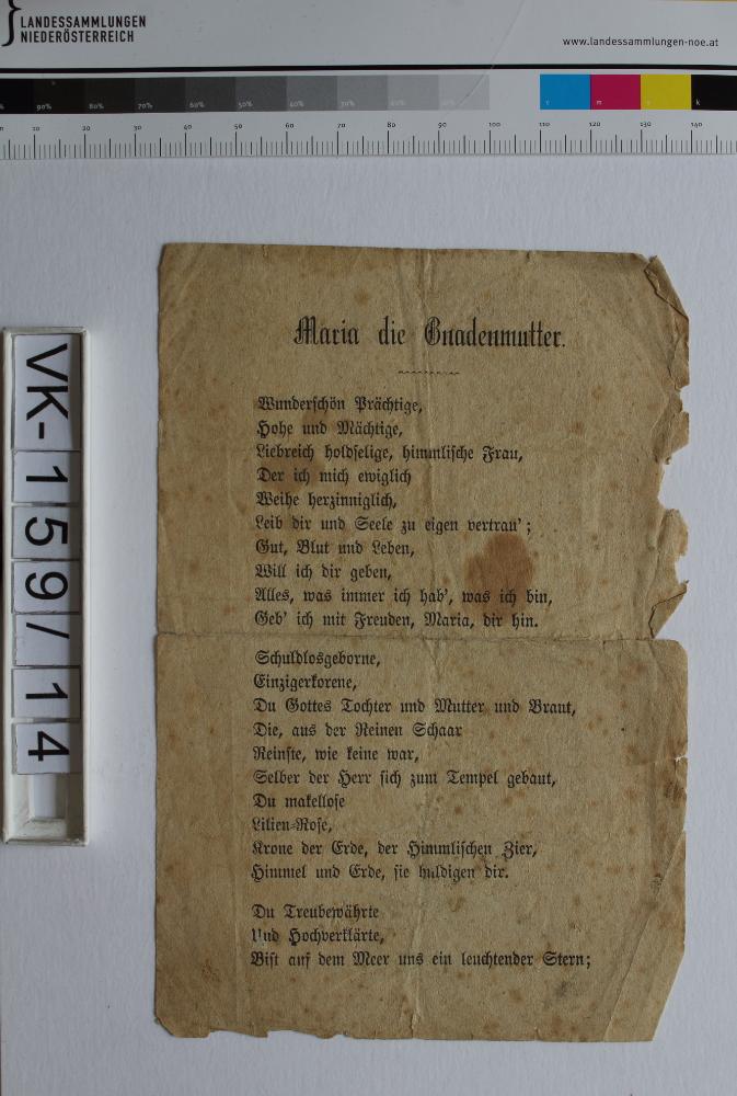 Geistliche Lieder; 1 Blatt: "Maria die Gnadenmutter", "Druck und Verlag des keth. Preßvereins in Linz", Abbildung: Ornament; Vermerk auf Kuvert (Schutzhülle): "Maria die Gnadenmutter, nach 1842/ Fassung v. Joh. Kardinal von Geissel"; Eintrag Inventarbuch: "18 geistliche Lieder (in einem Umschlag)