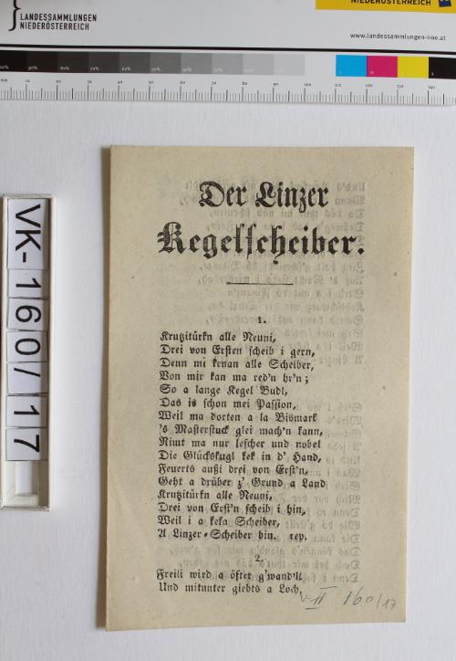 Weltliche Lieder; 1 Blatt, gefaltet: "Der Linzer Kegelscheiber", "Linz. Gedruckt und zu haben bei J. Schmid"; Eintrag Inventarbuch: "24 Lieder (einzelne Heftchen)"; Bemerkung Klein: 26 überschrieben mit 24