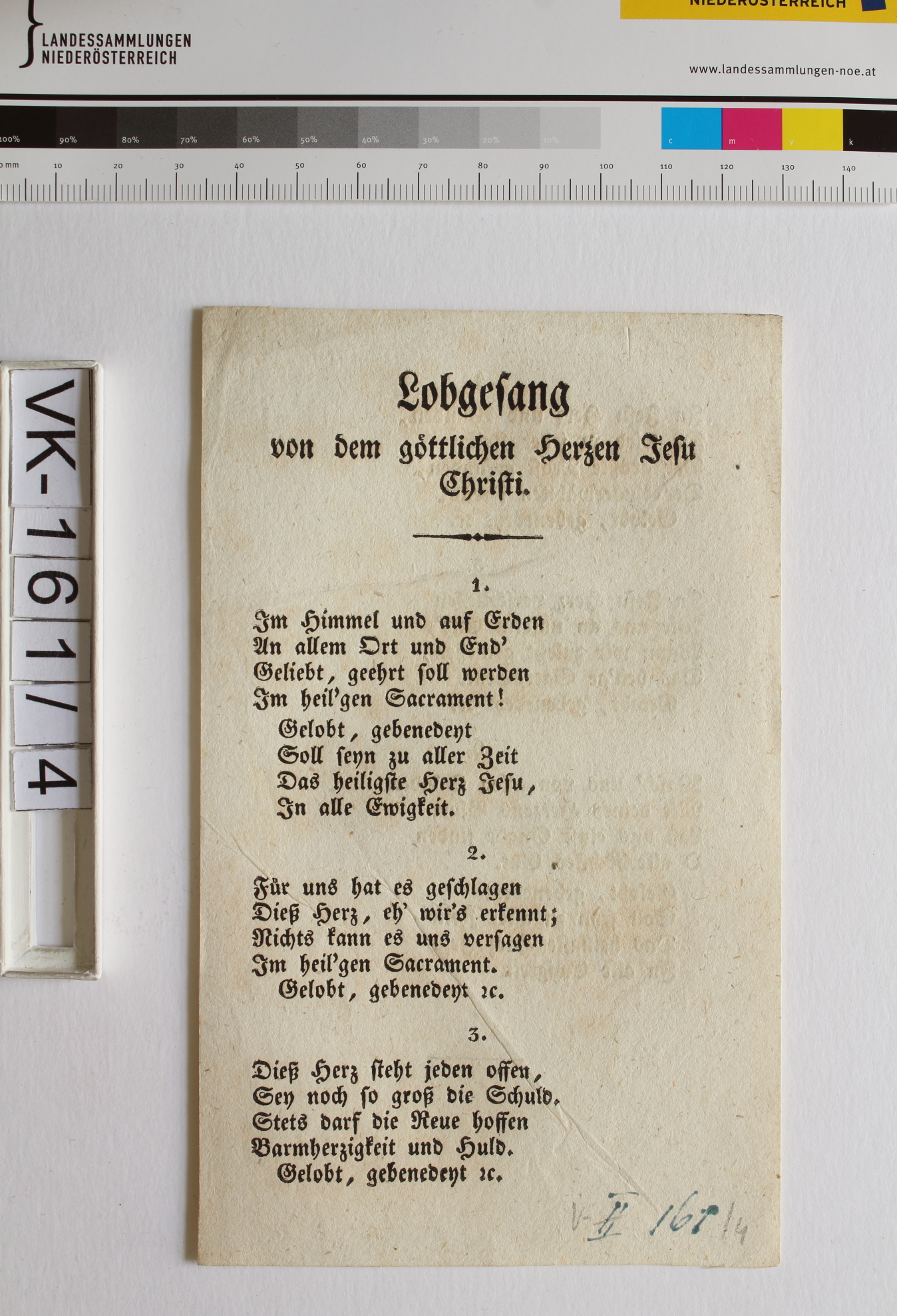 Lieder zu Jesus; 1 Blatt: "Lobgesang von dem göttlichen Herzen Jesu Christi"; Eintrag Inventarbuch: "Lieder zu Jesus etc. (in einem Umschlag"