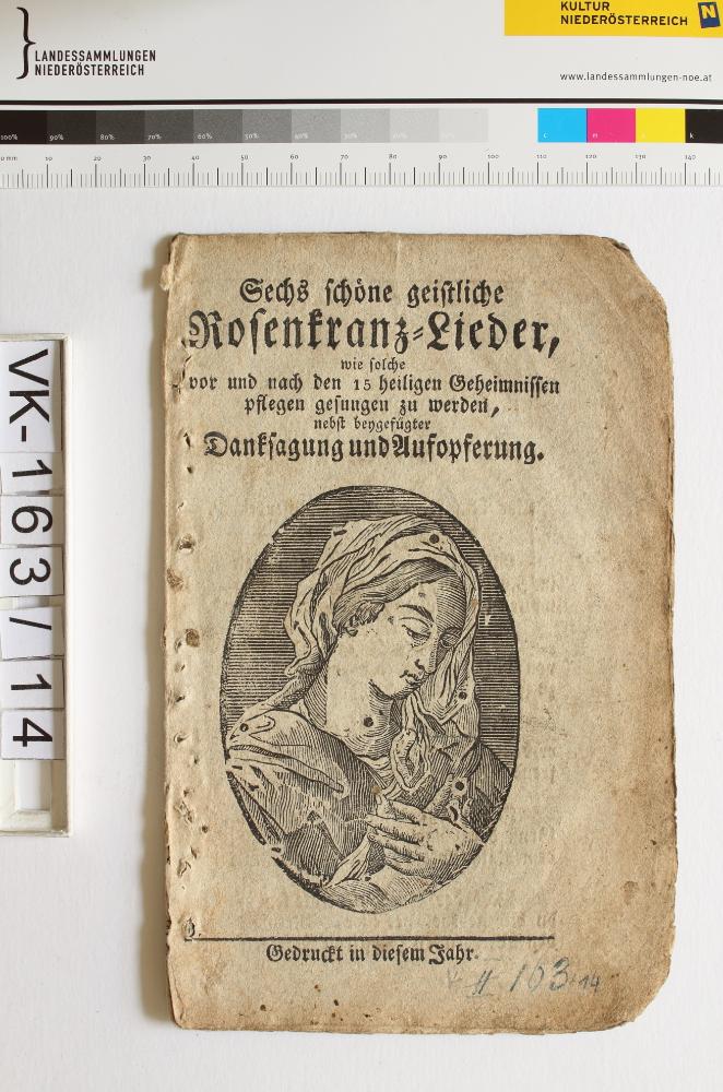 Marienlieder; 4 Blatt, gefaltet, geheftet: "Sechs schöne geistliche Rosenkranz=Lieder, wie solche vor und nach den 15 heiligen Geheimnissen pflegen gesungen zu werden, nebst beygefügter Danksagung und Aufopferung", Abbildung: Maria (Brustbild), "Gedruckt in diesem Jahr"; Eintrag Inventarbuch: "Marienlieder"