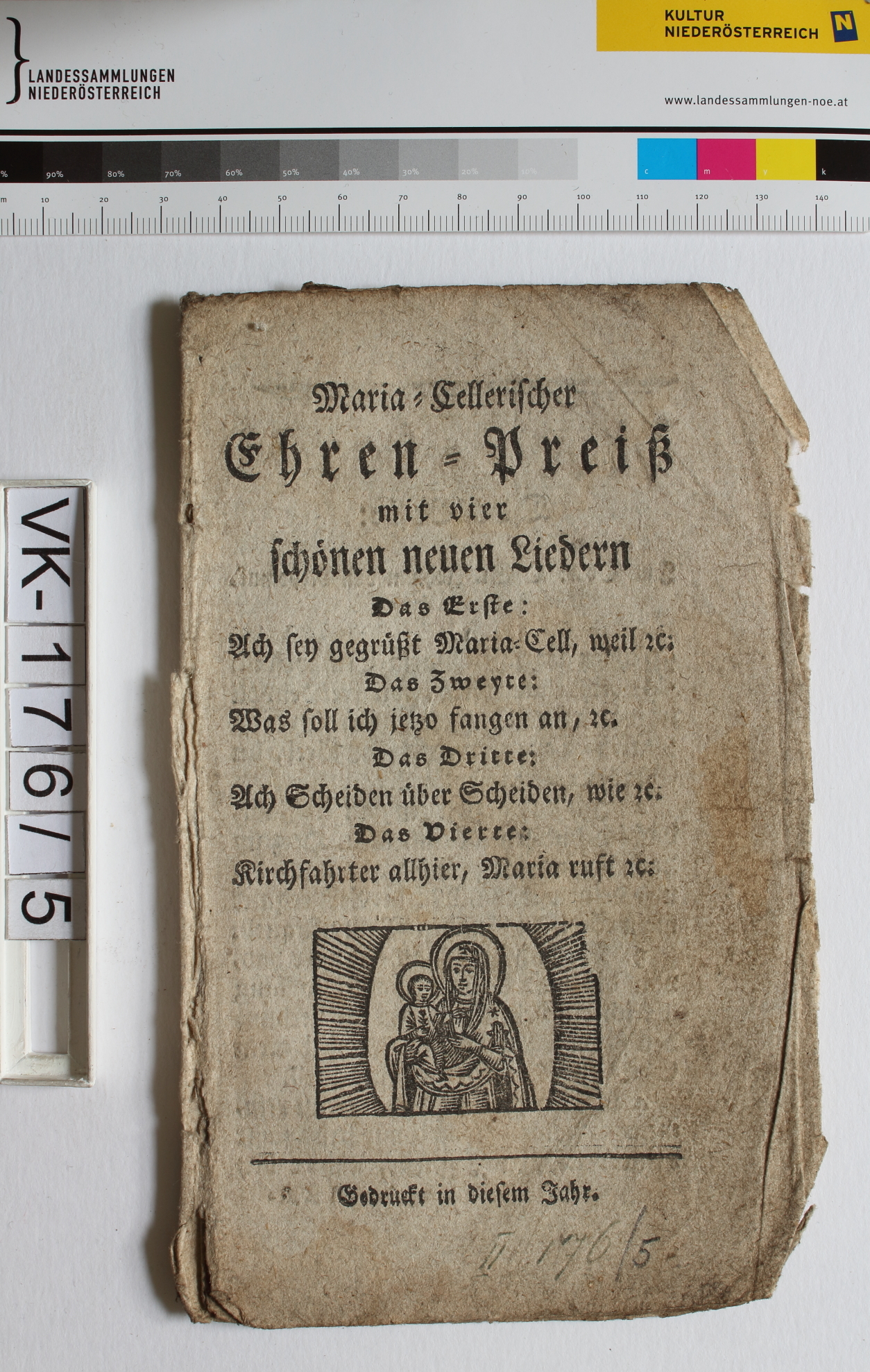 Mariazeller Wallfahrtslieder; 2 Blatt, gefaltet, geheftet: "Maria=Cellerischer Ehren=Preiß mit vier schönen neuen Liedern. Das Erste: Ach sey gegrüßt Maria=Cell, weil ec./ Das Zweyte: Was soll ich jetzo fangen an, ec./ Das Dritte: Ach Scheiden über Scheiden, wie ec./ Das Vierte: Kirchfahrer allhier, Maria ruft ec.", Abbildung: Gnadenbild = Maria mit Kind, "gedruckt in diesem Jahr"; auf allen Seiten handschriftliche Vermerke = unleserlich; Eintrag Inventarbuch: "Mariazeller Wallfahrtslieder; Wallfahrtsmuseum Kleinmariazell III/2-588/22m-1974, Galler 3.4.1974, ab 1983 Mödling"