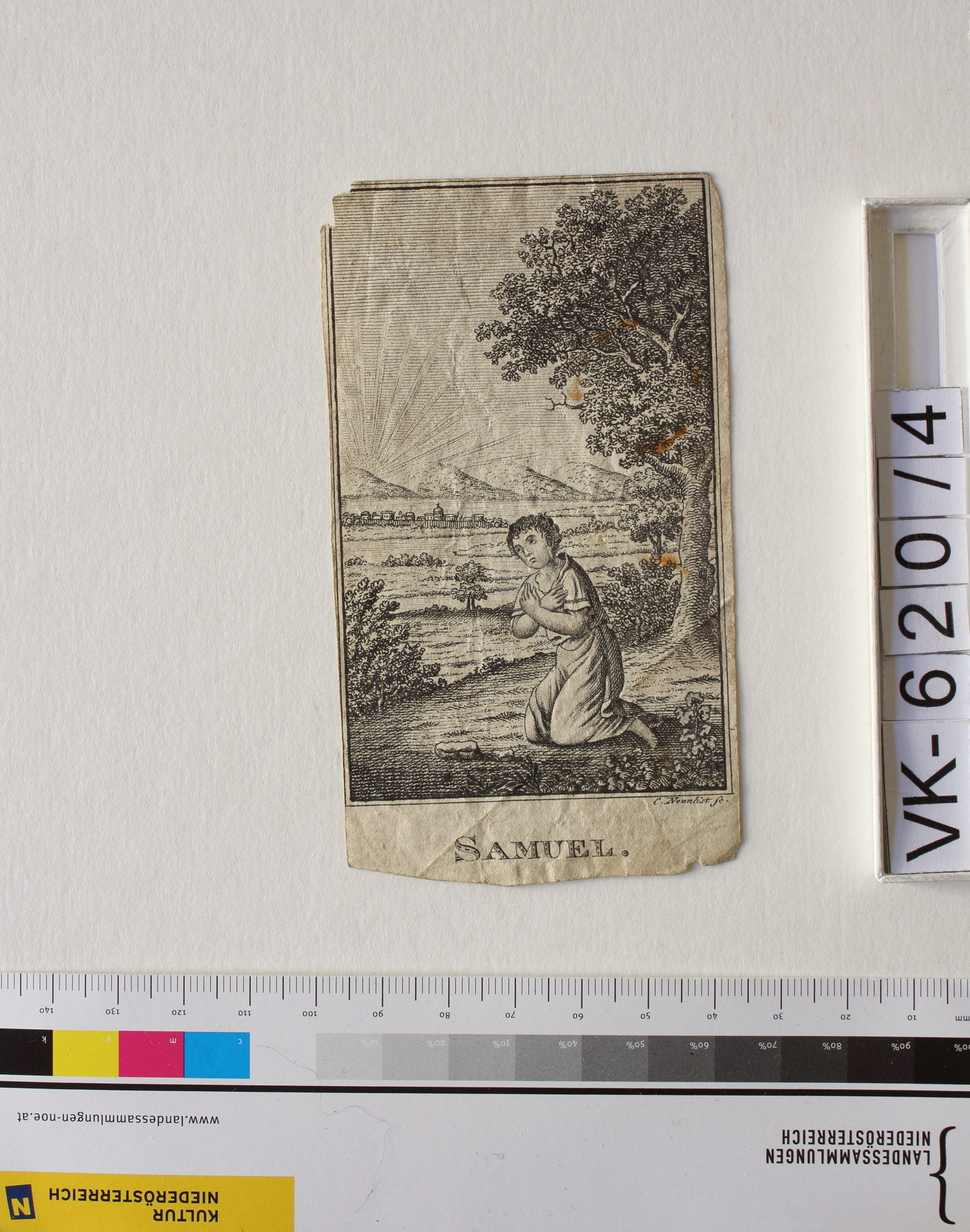 Altes Testament; Vorderseite: Samuel, folgt dem Ruf Gottes, "Samuel", "C. Neunlist sc."; Eintrag Inventarbuch: "Darstellungen alttest. Bildchen"