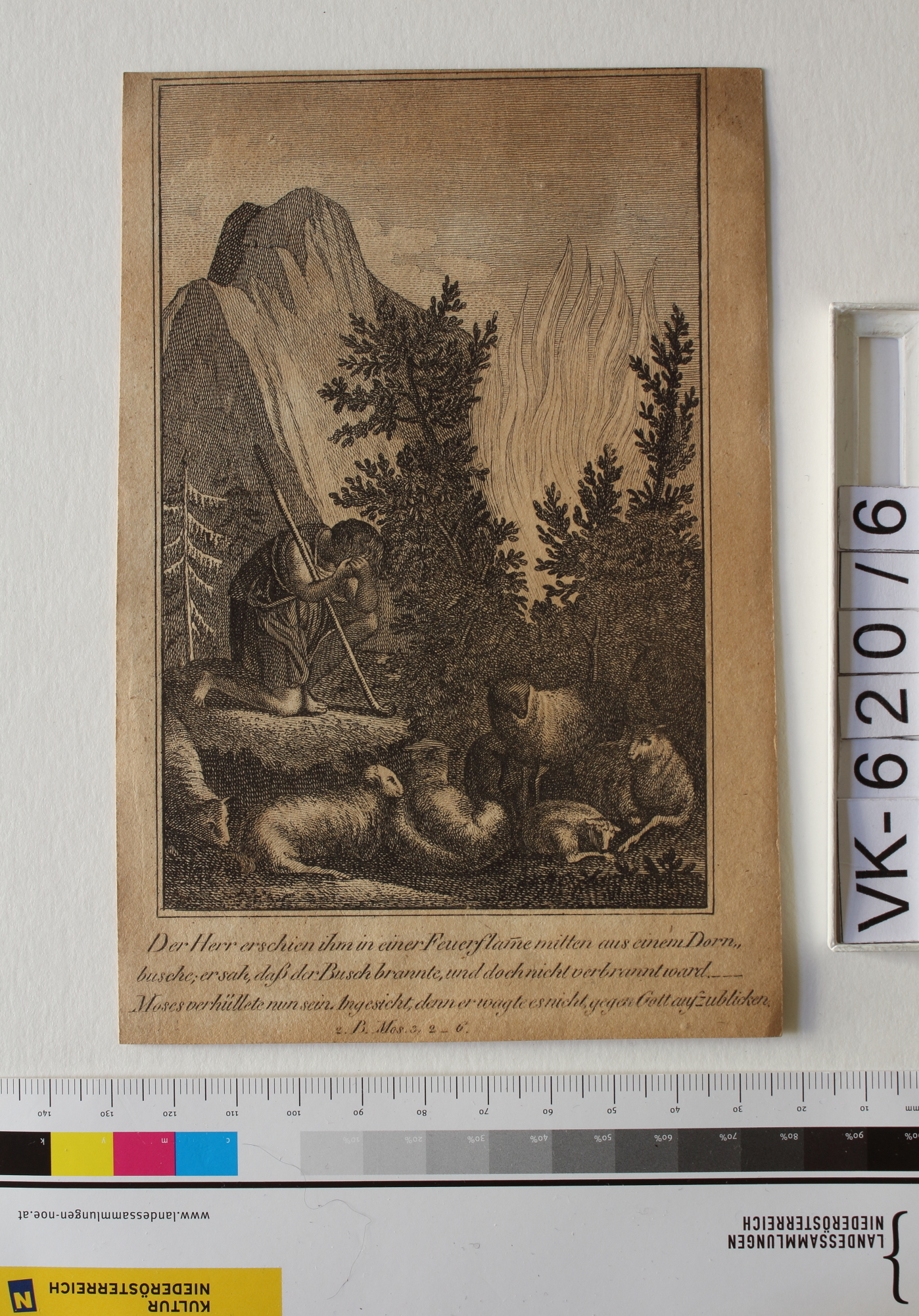 Altes Testament; Vorderseite: Moses mit brennendem Dornbusch, Schafe, "Der Herr erschien ihm in einer Feuerflamme mitten aus einem Dornbusche…z. B. Mos. 3, 2-6"; Eintrag Inventarbuch: "Darstellungen alttest. Bildchen"