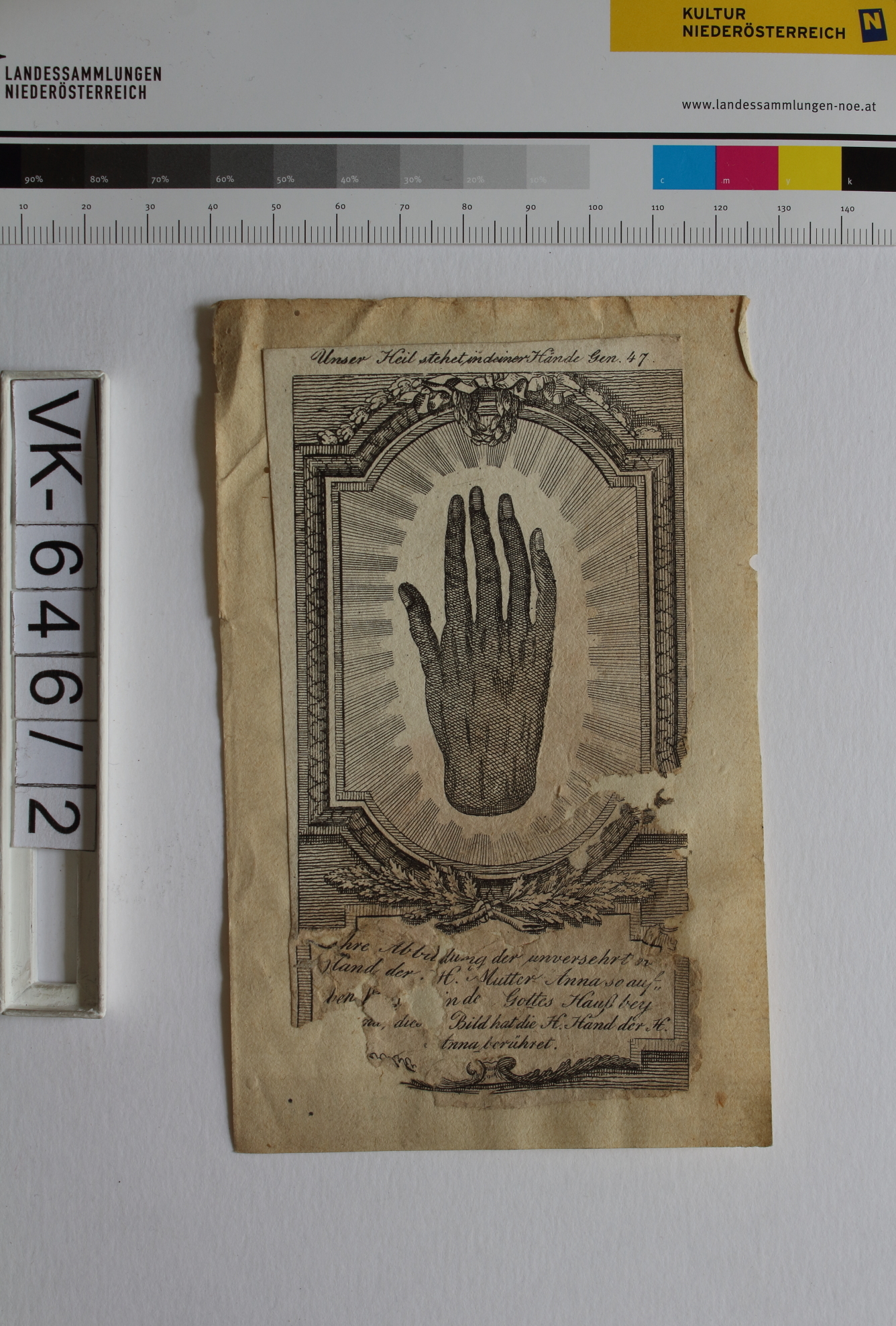 Handfragen; 1 Blatt: "Unser Heil stehet in deiner Hände Gen. 47/ Ihre Abbildung der unversehrten Hand der H. Mutter Anna", Abbildung: Heilige Hand = Annahand; verklebt auf Karton; Banderole: "Gebete, die nach dem Volksglauben von Krankheiten der Hände befreien helfen"; Eintrag Inventarbuch: "Handfragen, Waldviertel S K"