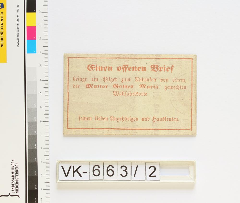 Wallfahrtsgebet; 1 Blatt, mehrfach gefaltet: "Einen offenen Brief bringt ein Pilger zum Andenken von einem, der Mutter Gottes Maria geweihten Wallfahrtsorte seinen lieben Angehörigen und Hausleuten", verschiedene Sprüche wie "Theure Freunde, lebet immer so, als wenn ihr täglich den Tod erwarten würdet", Gebete "Schmerzhafte Mutter und Jungfrau Maria! und "Gegrüßet seist du Maria", "Gedruckt bei Al. J. Landfraß & Sohn in Neuhaus", Abbildung: Maria, Maria mit Kind, Tafel mit 10 Geboten; Eintrag Inventarbuch: "Wallfahrtsgebete in Briefform"