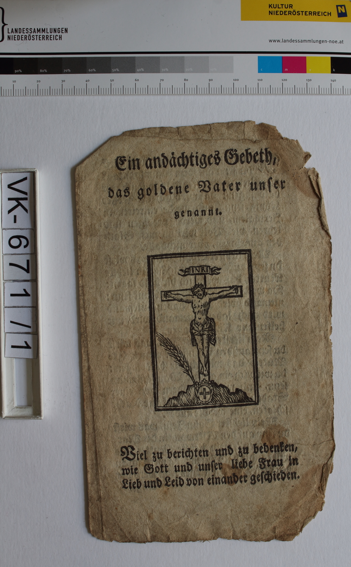 Goldenes Vaterunser; 1 Blatt, gefaltet: "Ein andächtiges Gebeth, das goldene Vater unser genannt", Abbildung: Kruzifix, Kornähre; Eintrag Inventarbuch: "Goldenes Vaterunser"