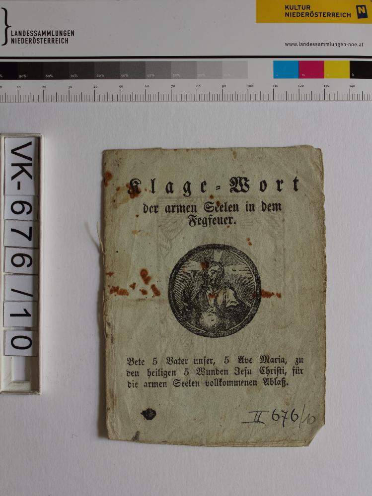 Armenseelengebete; 2 Blatt, gefaltet, geheftet: "Klage=Wort der armen Seelen in dem Fegfeuer", "Druck und Verlag M. F. Lenk in Znaim", Abbildung: Jesus, Maria mit Kind; Eintrag Inventarbuch: "Armenseelengebete"