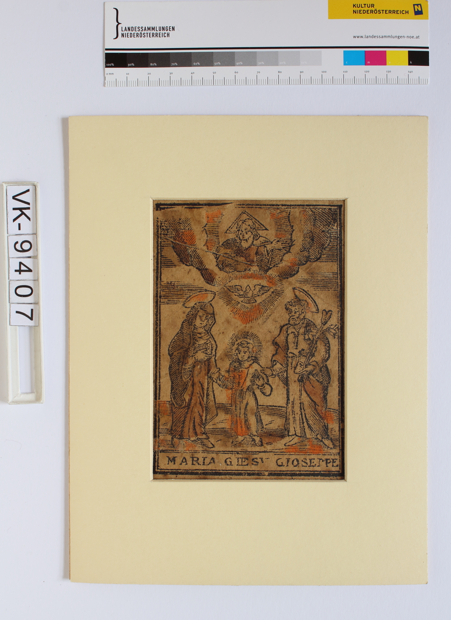 Hl. Familie; Vorderseite: Maria, Josef mit Lilie, Jesus, Gottvater, Heilig-Geist-Taube, "Maria Giesu Gioseppe"; Eintrag Inventarbuch: "Hl. Familie, Hl. Geist, Gottvater, Leg. Maria Jesu Gioseppe, kol. Holzschnitt, Slg. Staufenberger; GZ 611/ 36m"; verklebt auf Karton (21,4 cm x 16,5 cm), mit Passepartout