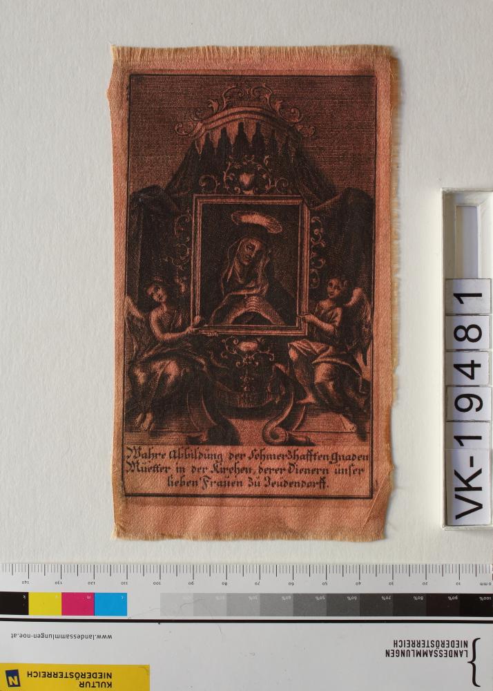 Jüdendorf (Österreich/ Ungarn)?; Vorderseite: Gnadenbild = Maria, Engel, "Wahre Abbildung der Schmerzhaften Gnaden Muetter in der Kirchen derer Dienern unser lieben Frauen zu Jeüdendorff"