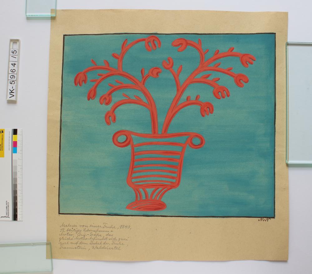 Zeichnung aus der Serie Waldviertler Heimatbilder: " MN Malerei von einer Truhe, 1843, 12 blütiges Lebensbaum-Motiv, Orig.-Größe, das gleiche Motiv befindet sich zwei mal auf dem Deckel der Truhe, Traunstein, Waldviertel"; signiert; Eintrag Inventarbuch: "5964/1-15: 15 Farbkopien (Kasten- und Truhenbemalungen) von Milli Niedenführ; L.A. III/2-247/78m-1950: 5. Malerei einer Truhe, 1843, 12 blütiges Lebensbaum-Motiv, Orig.-Größe, das gleiche Motiv befindet sich zwei mal auf dem Deckel der Truhe, Traunstein, Waldviertel"