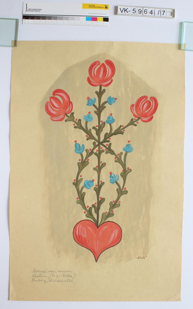 Zeichnung aus der Serie Waldviertler Heimatbilder: " MN Malerei von einem Kasten, (Orig.-Größe), Fraberg, Waldviertel"; signiert; Herz, Blumen; Eintrag Inventarbuch: "5964/1-15: 15 Farbkopien (Kasten- und Truhenbemalungen) von Milli Niedenführ; L.A. III/2-247/78m-1950: 7. Malerei von einem Kasten, Orig.-Größe, Fraberg, Waldviertel"