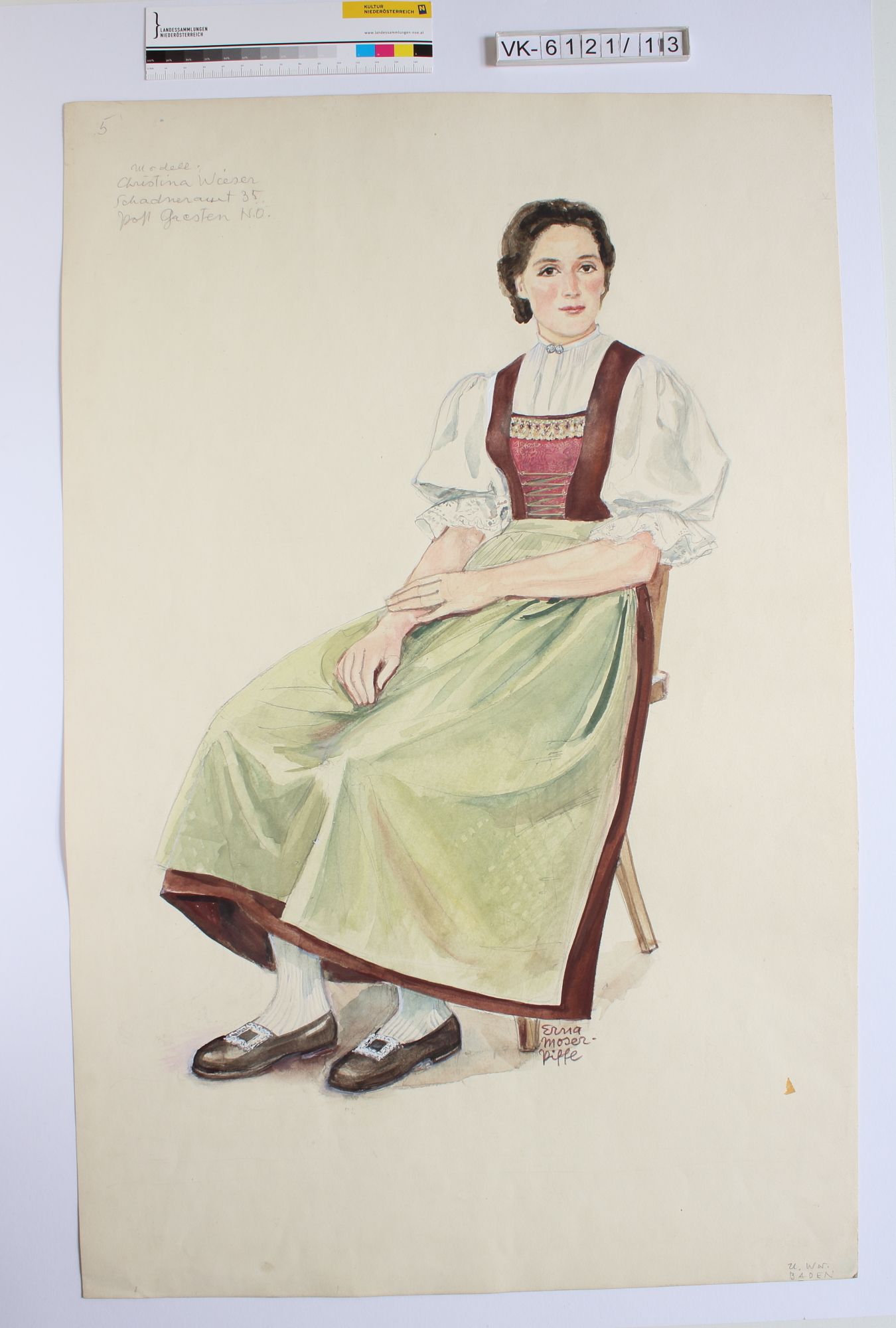 Zeichnung aus der Serie Waldviertler Heimatbilder: "Erna Moser-Piffl/ Modell: Christina Wieser, Schadneramt 35, Post Gaesten, NÖ./ U. Ww. Baden"; Rückseite: "Festtracht Baden"; signiert; Frau auf Sessel sitzend; Eintrag Inventarbuch: "6021: 20 Trachtenbilder aus der Scheibbser Gegend; Aquarelle; siehe Liste III/2-263m-56; lt. Kartei Akt vernichtet (2.7.2001); Erna Moser Piffl (Wien 8, Florianigasse 40/ 123); Vier Studien N.Ö. Trachten. Diese Trachtenstudien sollen auch dem N.Ö. Heimatwerk zur Verfügung stehen (á 400,-): a. Festtracht aus dem nördl. Waldviertel; b. Festtracht aus dem oberen Erlauftal; Burschentracht/ Ybbstal; Männertracht aus dem Weinland"; Eintrag Liste: "Festtagstracht, Frauen, Baden, Aquarell, 62/44"
