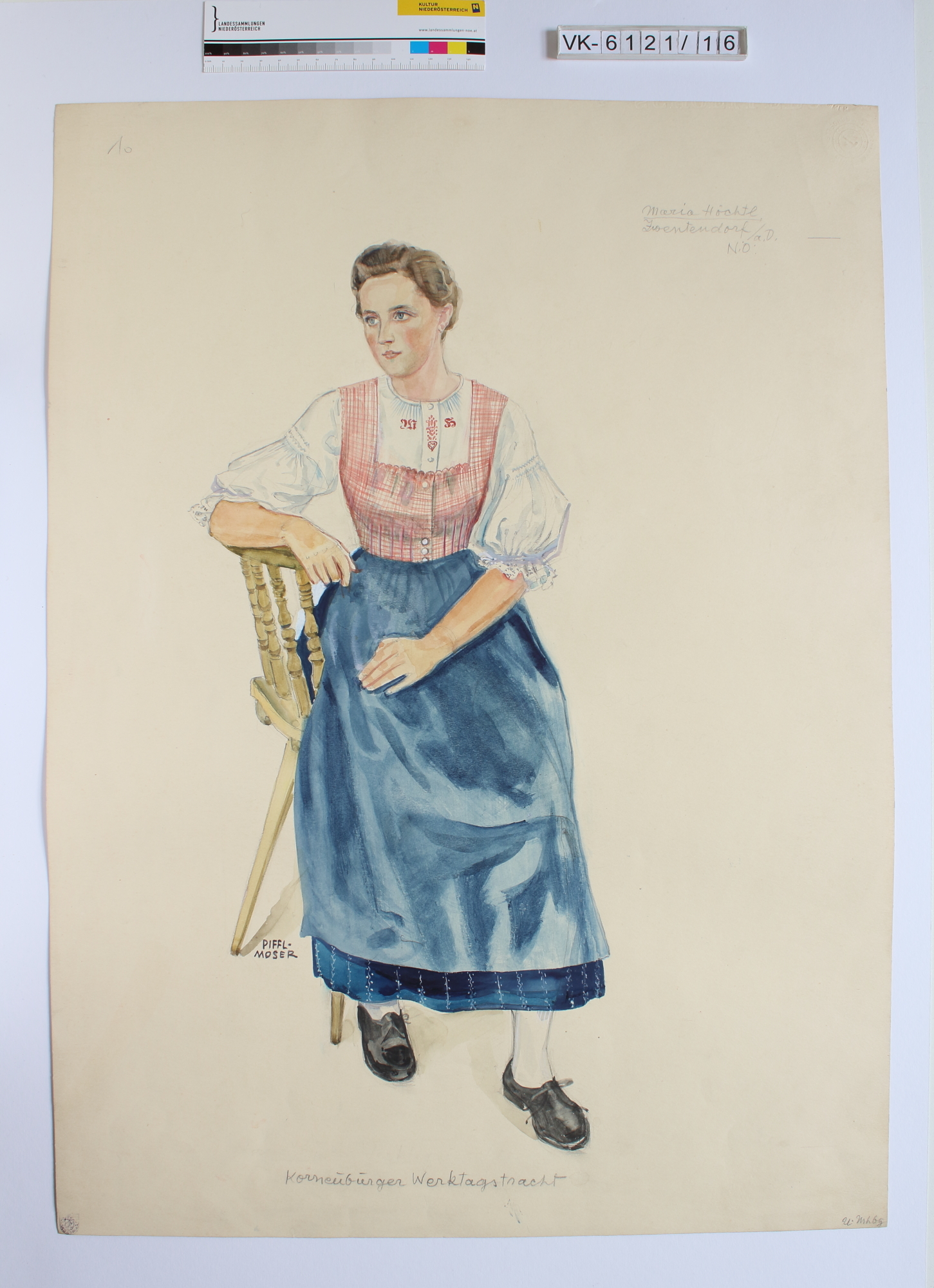 Zeichnung aus der Serie Waldviertler Heimatbilder: "Moser-Piffl/ Korneuburger Werkstagstracht/ U.Mhby/ Maria Höchtl, Zwentendorf /a.D., NÖ"; signiert; Frau auf Sessel sitzend; Eintrag Inventarbuch: "6021: 20 Trachtenbilder aus der Scheibbser Gegend; Aquarelle; siehe Liste III/2-263m-56; lt. Kartei Akt vernichtet (2.7.2001); Erna Moser Piffl (Wien 8, Florianigasse 40/ 123); Vier Studien N.Ö. Trachten. Diese Trachtenstudien sollen auch dem N.Ö. Heimatwerk zur Verfügung stehen (á 400,-): a. Festtracht aus dem nördl. Waldviertel; b. Festtracht aus dem oberen Erlauftal; Burschentracht/ Ybbstal; Männertracht aus dem Weinland"; Eintrag Liste: "Werktagstracht, Frauen, Korneuburg, Aquarell, 62/44"