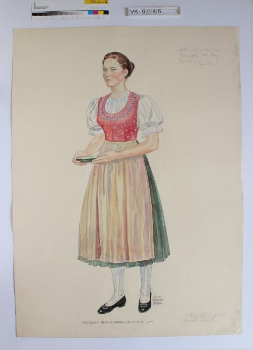 Zeichnung in der Art der Serie Waldviertler Heimatbilder: "Erna Moser-Piffl/ Festtracht Gegend Bruck a. d. Leitha/ Lotte Stigleitner, Rohrau 40 Buz. Bruck/ Leitha/ U. Ww.; signiert; Frau stehend, Teller in den Händen haltend; Eintrag Inventarbuch: "Tracht, Bruck a. d. Leitha, Wienerwald, Aquarell; III/2-2/61m-58, 18.6."