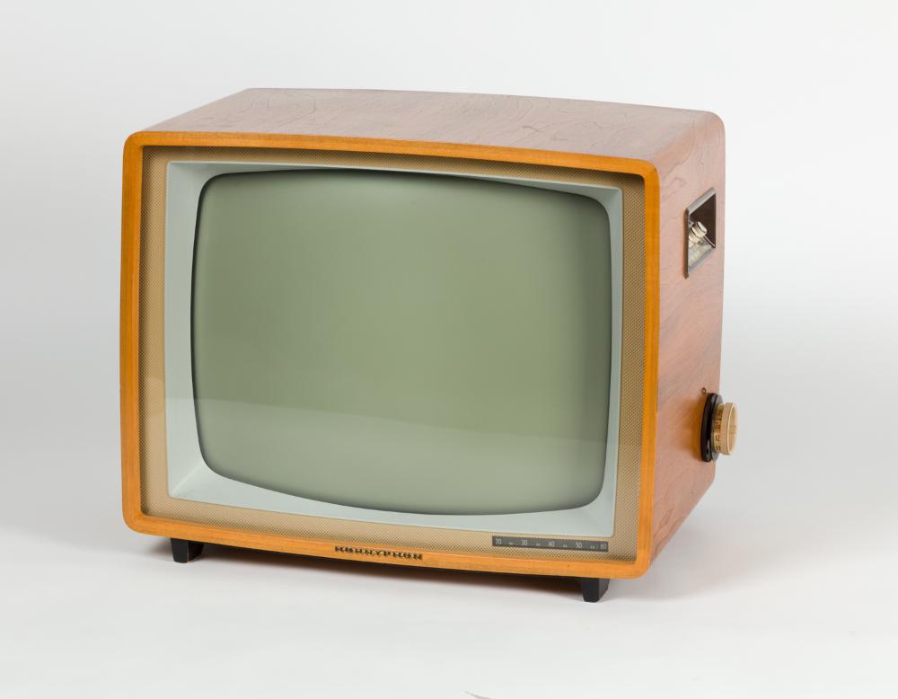 Fernsehapparat, Modell Excelsior 48 Typ W48T033A (Nr. 87726) der 1923 von Friedrich Horny in Wien gegründeten Marke Hornyphon. Helles Bugholzgehäuse (verm. Esche furniert) mit braunen und elfenbeinfarbenen Kunststoffelementen sowie beschlägen aus teils lackiertem Messing.