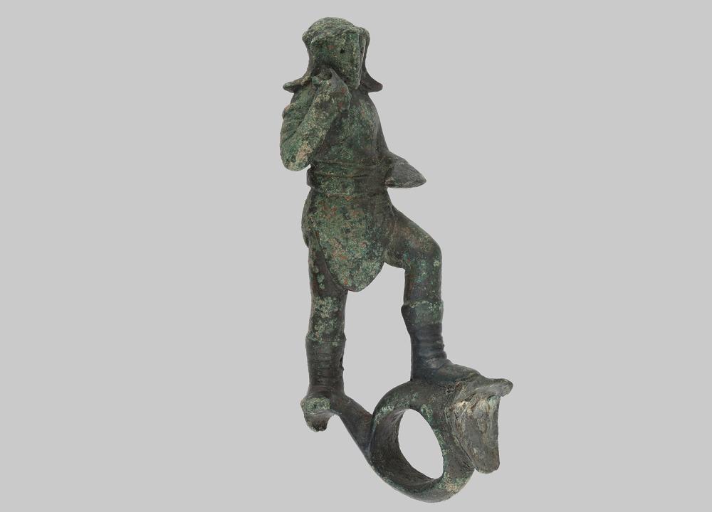 Der Gladiator steht auf einem bandförmigen Ringhenkel und gibt sich damit als Aufsatz einer bronzenen Öllampe zu erkennen. Der Lampenkörper selbst ist nicht erhalten geblieben. Der Gladiator trägt einen Lendenschurz (subligaculum) mit Gürtel, einen Armschutz (manica), der bis zur Schulter reicht, sowie Gamaschen oder dicke Bandagen an beiden Unterschenkeln. Der ovale schmucklose Helm weist zwei kleine runde Augenlöcher, eine plastisch ausgebildete Visiermittelschiene und einen großen Nackenschirm auf. An der Rückseite treten unter dem Helm zwei Bänder hervor, die über den Rücken nach unten hängen. In der rechten Hand hielt der Gladiator ursprünglich das Schwert, in der linken den Schild. Der charakteristische Helm mit den kleinen Augenlöchern lässt an eine bekannte Gladiatorengattung, den secutor („Verfolger“), denken, der auf den Kampf gegen den mit Dreizack und Netz bewaffneten retiarius (Netzkämpfer) spezialisiert war.