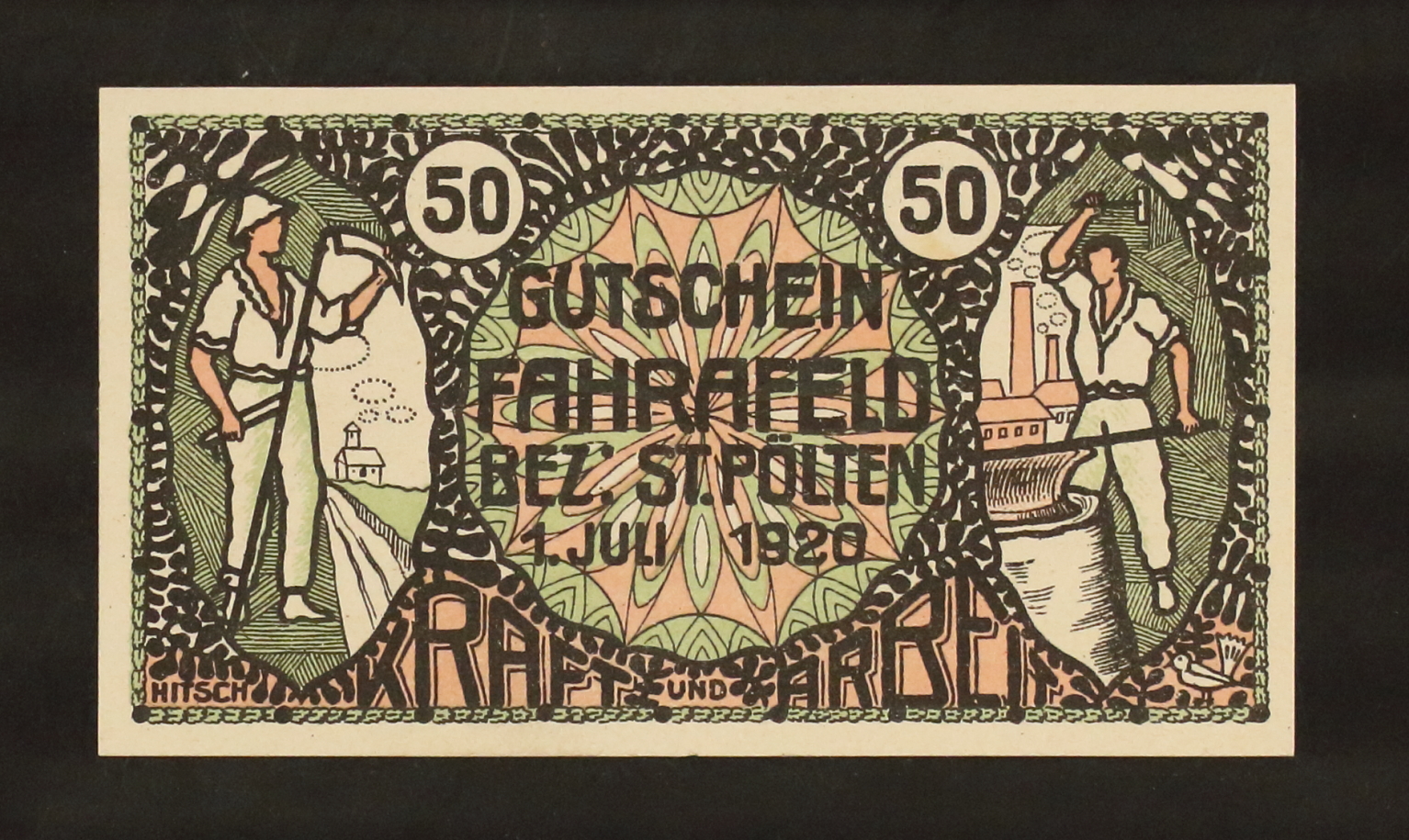 Notgeldschein aus Fahrafeld, Bez. St.Pölten, Jugendstilmotiv, Abb. Mann mit Sichel und Mann mit Amboss.