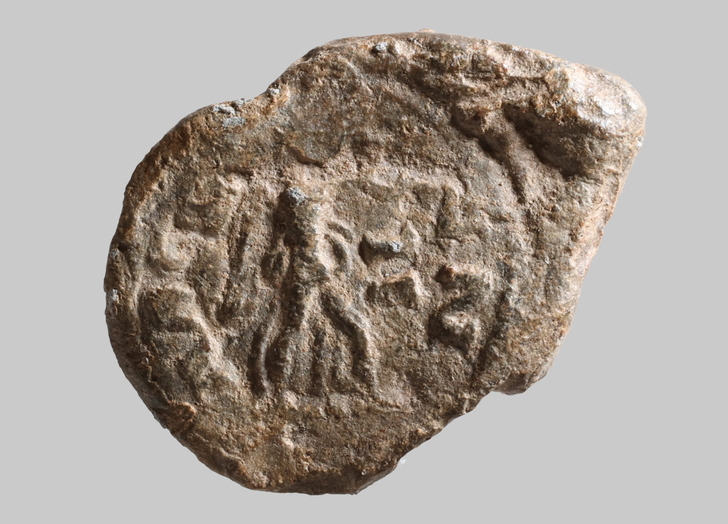 Rundliche Plombe mit Zipfel im oberen rechten Eck und rundem Stempel. Victoria im Profil nach rechts, Beine im Ausfallschritt, dazwischen Gewandfalten, Gewand im Hüftbereich gegürtet und vorne gebauscht, auf der linken Seite angezogene Flügel erkennbar. Auf der rechten Seite Arme vor sich ausgestreckt, obere Hand hält Kranz. Umschrift in Ansätzen erhalten – links [AΛ A…]? oder [NAVA]? und rechts [NN]. Auf der Rückseite Abdruck von drei parallel erhabenen Linien. Diagonale doppelte Durchlochung von zwei Schnurführungen